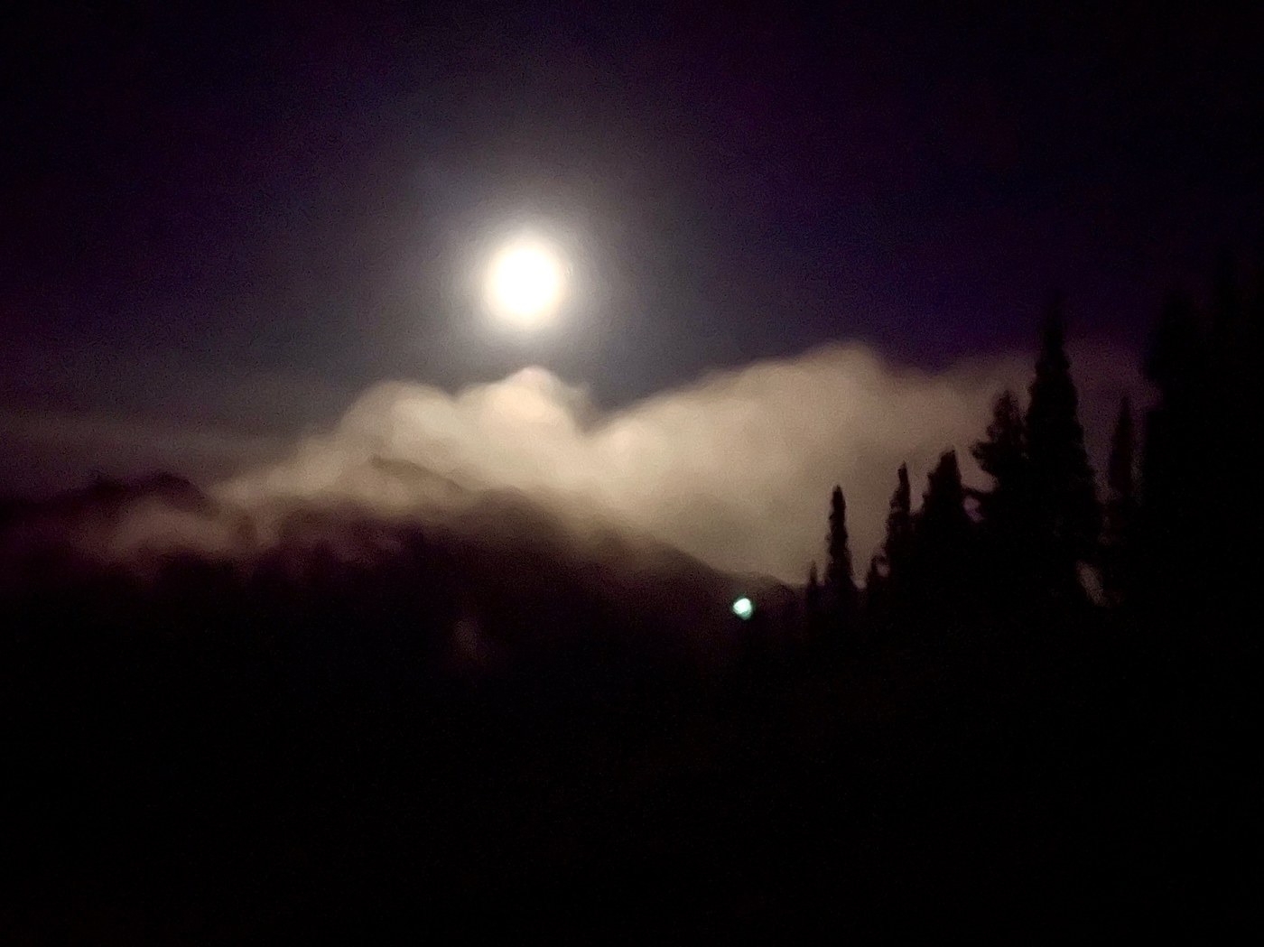 Day 2: we had a late start, rain on and off. I had believed it would be a fairly short day, but boy was I mistaken.. note we were now entering primitive unmarked Trail territory, you pass the sign that leads you to Boulder Creek or points back to sol duc. We head straight, to travel to spread Eagle Pass and the cat basin primitive way, trails. We thought we had a break in the rain, so off we went. I was aware that I am on unmaintained way trail and felt prepared but I may have over estimated my technical abilities in some places, I cannot recommend spread Eagle Pass and cat basin way trails in rainy conditions, whatsoever, not only is the trail extremely overgrown with trees and bushes. It also had a few exposed rock areas where it took all fours to pass down chutes holding ‘green rope’ with full backpacks which was challenging, probably OK during dry conditions, during wet conditions I feel this could be considered dangerous, as water starts to flow thru the way trail chutes in some sections like a creek. The erosion on a boot path, as well as some areas there are trees that are growing out in the middle of the trail. Passing through the branches and brush constantly so despite rain gear we were soaked. The trail is easy to spot and way find without a GPS for most of it. As we traveled it felt like after we would cross one difficult section and I thought we were done, only to then come upon at least 11 rock slide areas where thankfully somebody has marked those with cairns, but again, during rain the rock is pretty slippery and awkward so we had to just move slowly and carefully skirting around the gorgeous basin in these horrible conditions. I mostly just found it sad how unmaintained this entire section is, because it is so gorgeous and would be awesome if maintained! Due to the conditions, it took us many hours only moving about 4 miles, I believe? Finally we made our way to our lake camp for the evening. As we were caught in many downpours and there is nowhere to wait out the rain. It is just exposed rock and brush the entire trail so we had to continue forward despite heavy rain showers due to no where to stop! By the time we set up camp we were probably nearly hypothermic. We rushed to strip off wet clothes and found some mostly dry clothes to put on from our pack. This is all soaked despite having rain pants, gators, raincoats, and pack covers. ugh, well we were thankful we brought a lot of dry camp food in our bear canister so we did not need to cook and had to eat inside the tent which I know is not recommended but the downpours made it so. We were asleep by 9 PM. I woke up around 11 PM and the rain cleared out and we got a quick shot of the gorgeous Sturgeon moon.