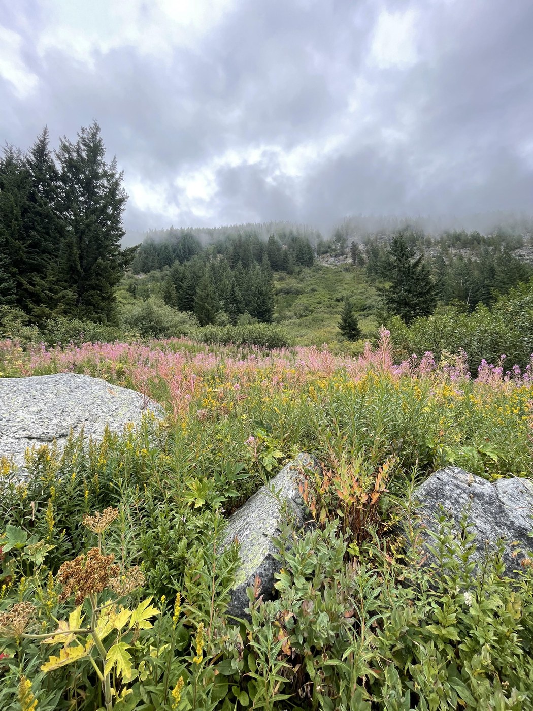 Breaking the hike in 4 phases, started with a pleasant mild climb till the first river crossing (couple of open views facing south), then a steepier hike to the main bowl (under Grindstone Mountain) essentially under the trees, often one person wide trail with plenty of overgrown bushes, then you hike the bowl on its right side (amazing view of what avalanches can do to the forest), a very steep climb to come over the ridge (marmots and grouses) lastly the larsh / rocks "meadow" area. At least that is how we saw it. Plenty of opportunity to get water along the trail. Huckeberries and berries in general were ripped and plentiful.