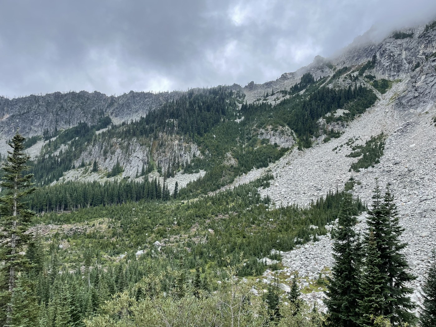 We were soaked by end of phase 1, plowed forward, till the thunderstorms moved in at which point we decided to set camp 1/2 mile before lake Edna. Good move though, we got stuck in our tent through several thunderstorms, freezing rain and snow. We headed back the next day as the skies did not seem to want to clear up and the clouds/fog did not clear up. The hike down is a good workout.