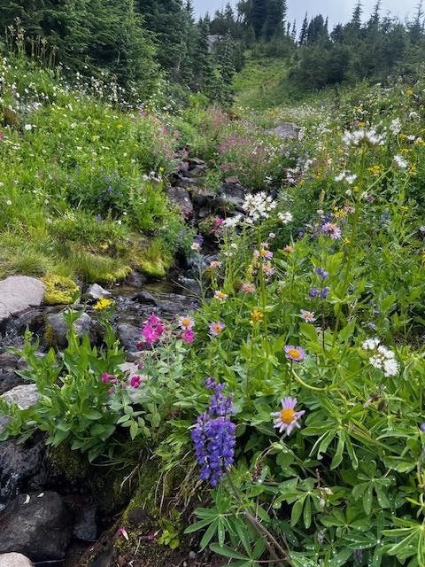 Arrived at the Snowgrass TH on a Monday and found 20 cars there (about another 40 at the Berrypatch TH nearby). Basic itinerary: Day 1, make camp at Snowgrass Creek along the ByPass Trail, then explore the Cispus Basin almost to Cispus Pass and then a mile or two up the PCT in the direction of Old Snowy. Day 2, return to Snowgrass Trail and go up to Lily Basin Trail and then Goat Lake, returning “counter-clockwise” over Goat Ridge, down into Jordan Basin and then back to Snowgrass TH from Berrypatch TH on the connector trail.