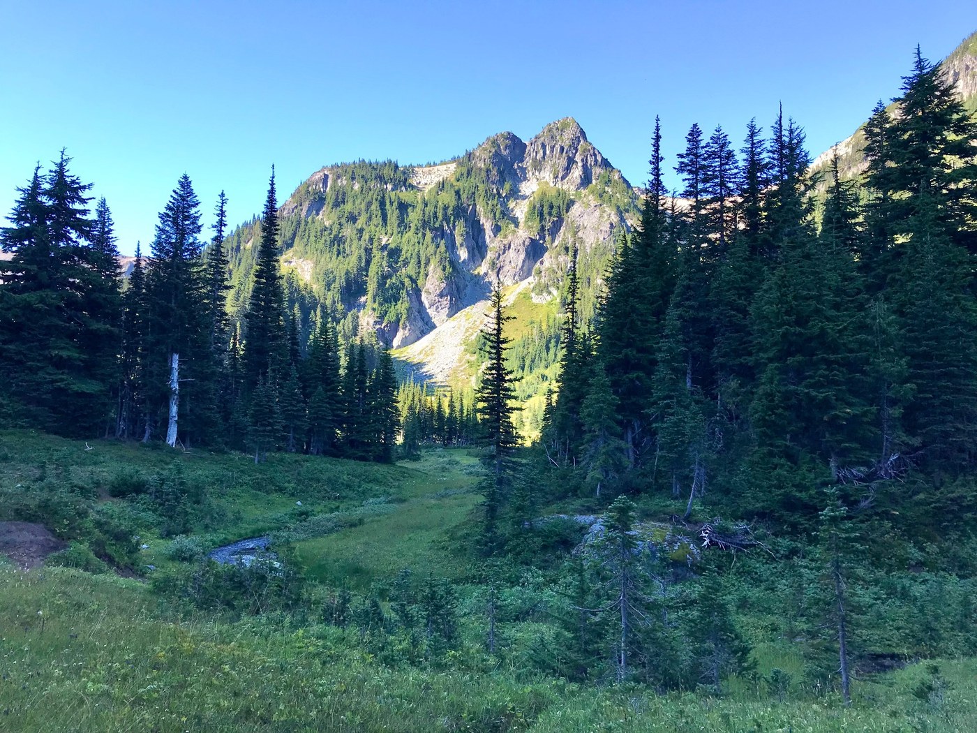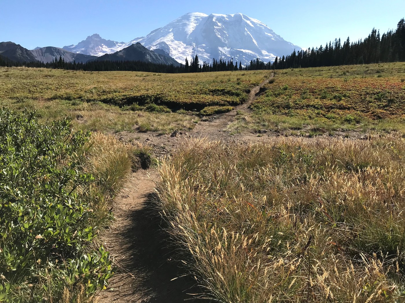 Sunrise was warm and breezy; we were soon packed and a slow climb up to the top of Sourdough Ridge got most of the grunt work out of the way quickly. Crowds were mild all the way to the always busy intersection at Frozen Lake and then non-existent for the rest of the first day. The views were super clear and stupendous, the plants that turn red in the fall were all on fire, such dramatic scenery. We dropped down first on the Wonderland trail then on the Northern Loop just enjoying the easy ride. We pushed the pace a little to get to camp for lunch. There is some discrepancy in mileage on this section and the camp was further than I thought so lunch was late, but the trail down through the park is gorgeous. Berkeley Park camp is a bit meh. There was already a large number of tents in the group site and site one was just a satellite to them, creek access is between these two. Fortunately, we scoped it out a bit and found the more private site two a few more paces down the main trail. Once set up and fed we set off again with much lighter loads on to our prize for the day - Grand Park.
