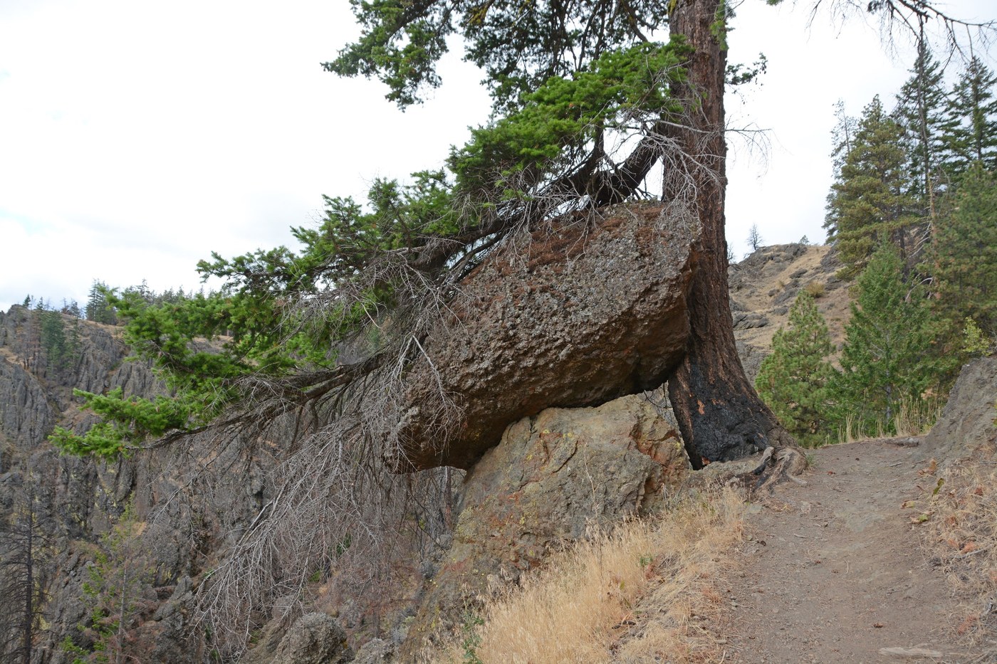 The hike was pleasant, with a fairly consistent grade. A moderate number of burnt trees line the route, but there are still plenty of green ones too. Farther along, the terrain opens up, offering interesting rock formations, large pine trees, and in one case both together.