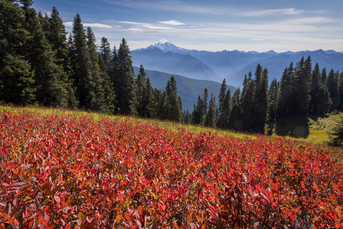 This is a tough hike with a nice payout at the very end of the ascent. The trail work, that has been described in other trip reports, makes the climb for the first ~4.25 miles straightforward as you continually climb through burned sections of mixed severity from the 2022 Suiattle River Fire. The vegetation has grown up through the course of the summer so you need to watch your footwork for wet sections, hidden rocks and holes. There are abundant mushrooms throughout the hike from the late August rains we received. From 4.25 miles to the meadows at south Huckleberry Mountain the trail often is hard to follow as it disappears in a more severely burned section but the density of burned and living brush is low enough to make travel not too difficult. The views from the meadow are fantastic taking in Dome, Glacier, and Sloan Peaks, Mt. Pugh and others. The huckleberry in the meadows is a vibrant red with some patches of berries but not abundant in most places.