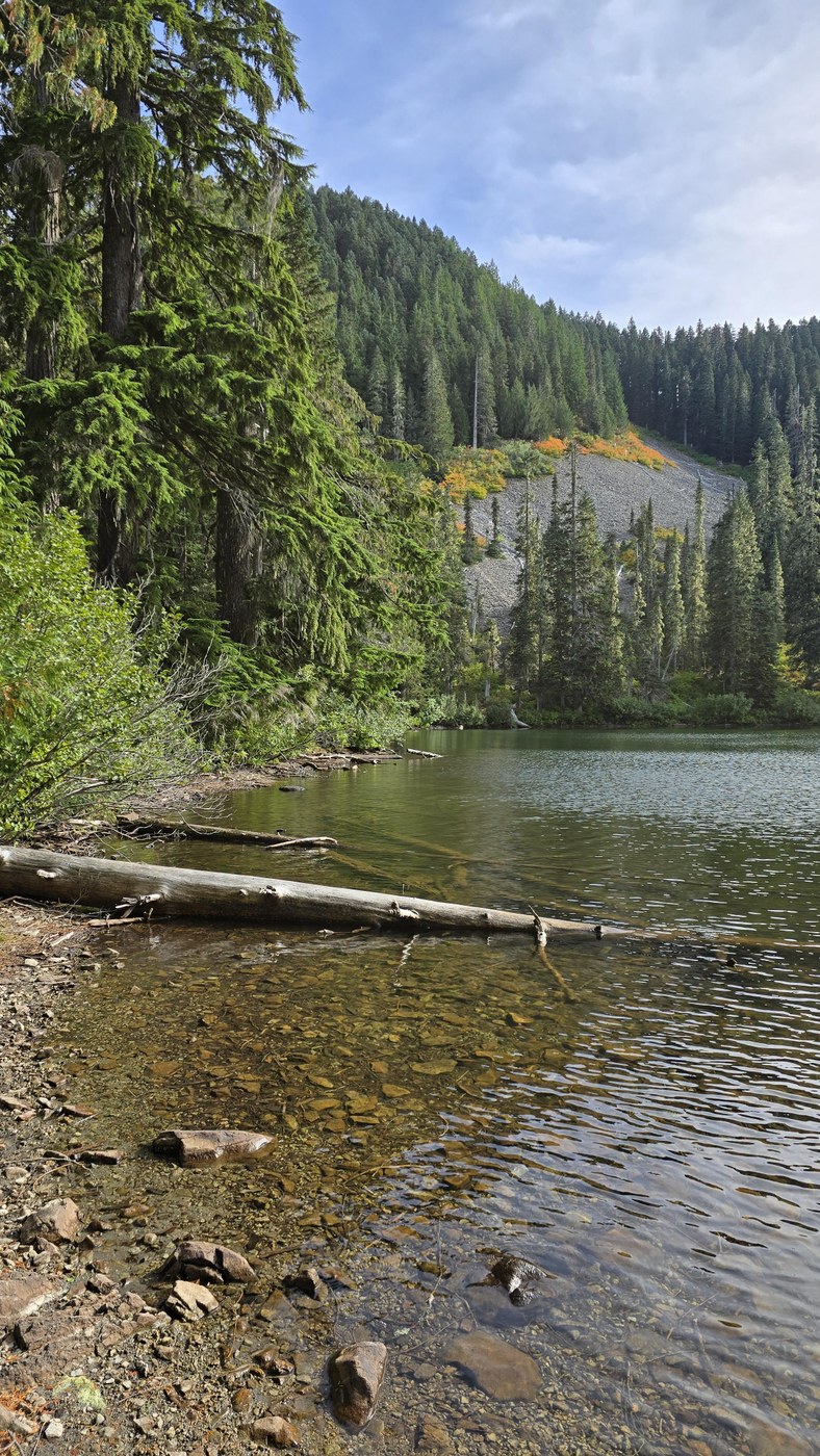 My bride and I started this 3-day backpacking trip from the Trapper Creek Trailhead by trail #192 then walked up Forestry Road #5401, crossed Trapper Creek, then took #133 up the ridge. The weather was in the 50s-70s, perfectly clear skies and not a single puff of wind. I can count the number of mosquitoes we saw on one hand, it was wonderful! There were several trees and large limbs down on the trail but all were safely passable. It looked like the last 400-600ft of elevation before reaching the lake had seen recent maintenance since the last rainstorm. No snow visible anywhere. The lake was crystal clear, full of crawdads, and had the occasional fish jumping. We found ripe and sweet blueberries in abundance on the south rim of the lake. We enjoyed circumnavigating the lake on our second day and ended the third with a great descent. It took us about 6 hours to hike in and 5 hours to hike out. We had the trail to ourselves both on the way in and the way out. There was one other backpacking overnighter on the other side of the lake and a few dayhikers showed up on the full day. Otherwise, it was dead calm, super quiet, incredibly peaceful, and absolutely gorgeous! All in all, it was certainly a strenuous hike with lots of switchbacks that required plenty of breaks. Trekking poles were a huge help. According to my hand drawn onX Backcountry route of the hike in, it was about 4¾ miles, 3,000ft of elevation gained, and 400ft of elevation loss.