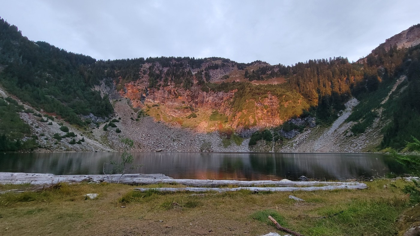We camped at Round Lake and did some light slackpacking along the ridge in the afternoon to nab a glimpse of Glacier Peak. It rained that evening and early in the morning, and we woke to temps in the 30s (we slept with our water filters). The moisture clinging to the inside and outside of our tent froze over night, so gloves were appreciated on this hike.
