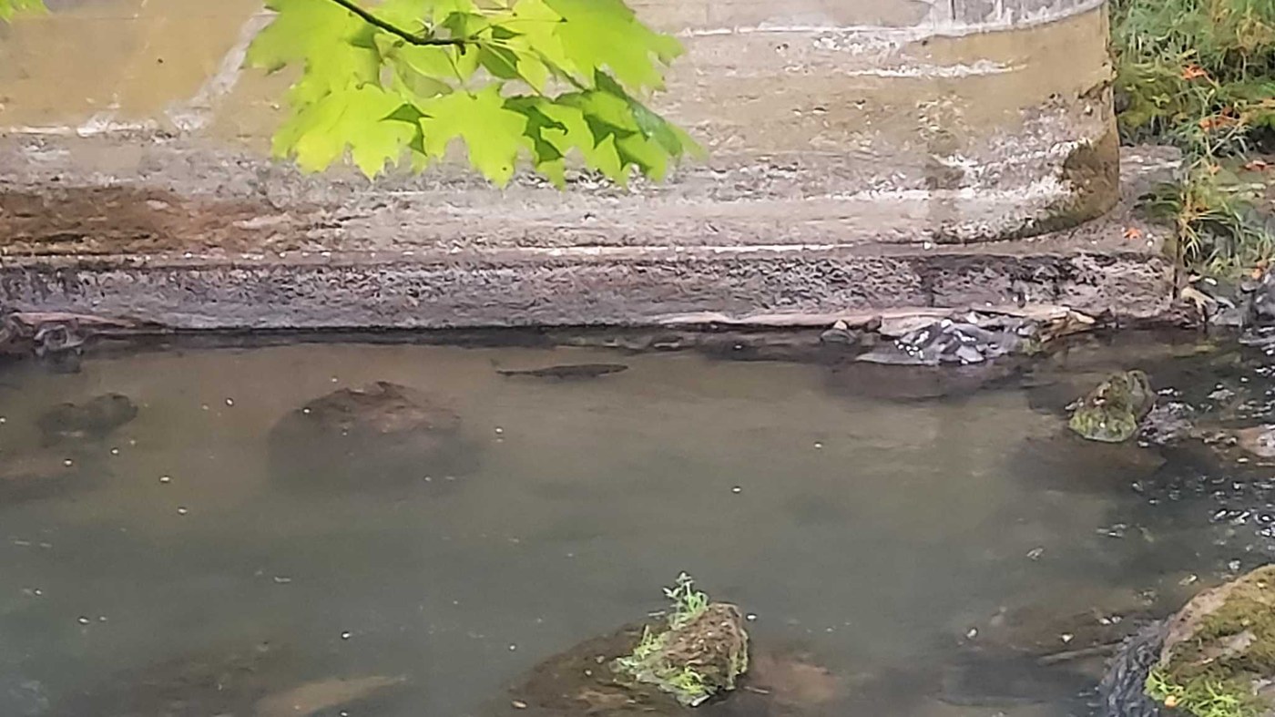 Lovely, if wet, walk along the trail this morning. Maple leaves are just starting to turn. Salmon can be seen in the pools along the way and jumping up along the concrete fish ladder. Windows in the concrete at the top of the fish ladder give an even better view of the salmon. A few fish carcasses on the rocks attracting scavengers.