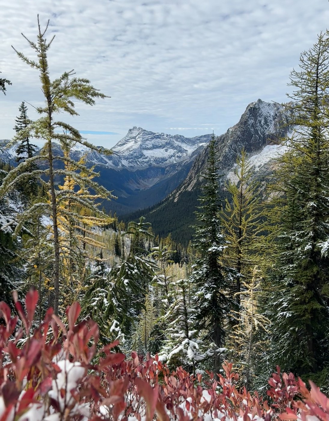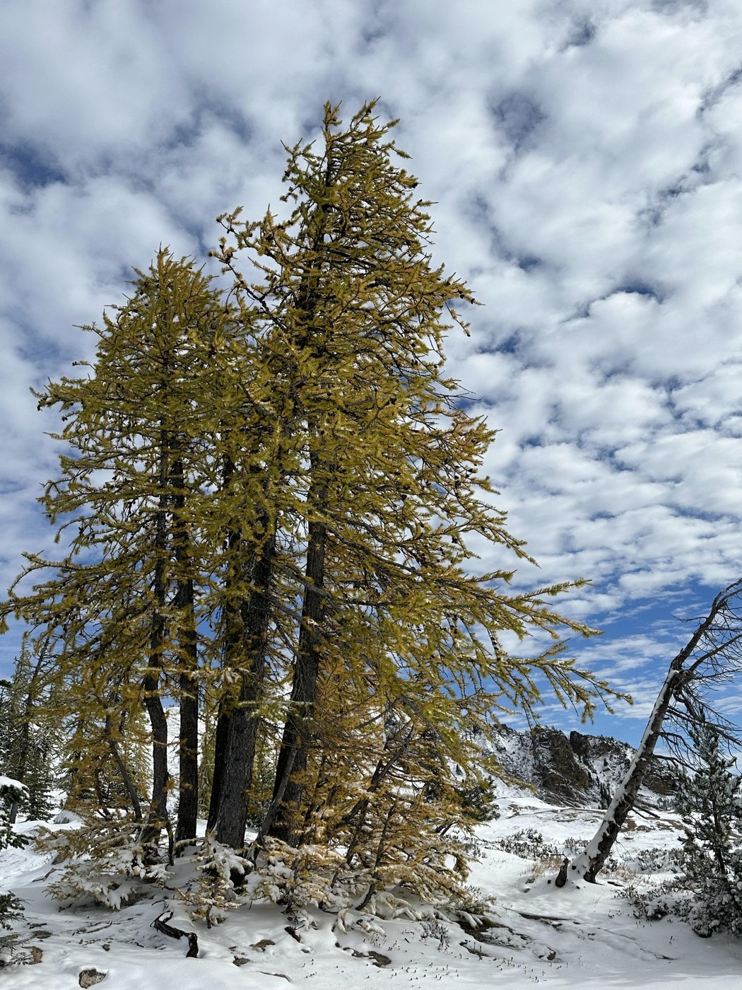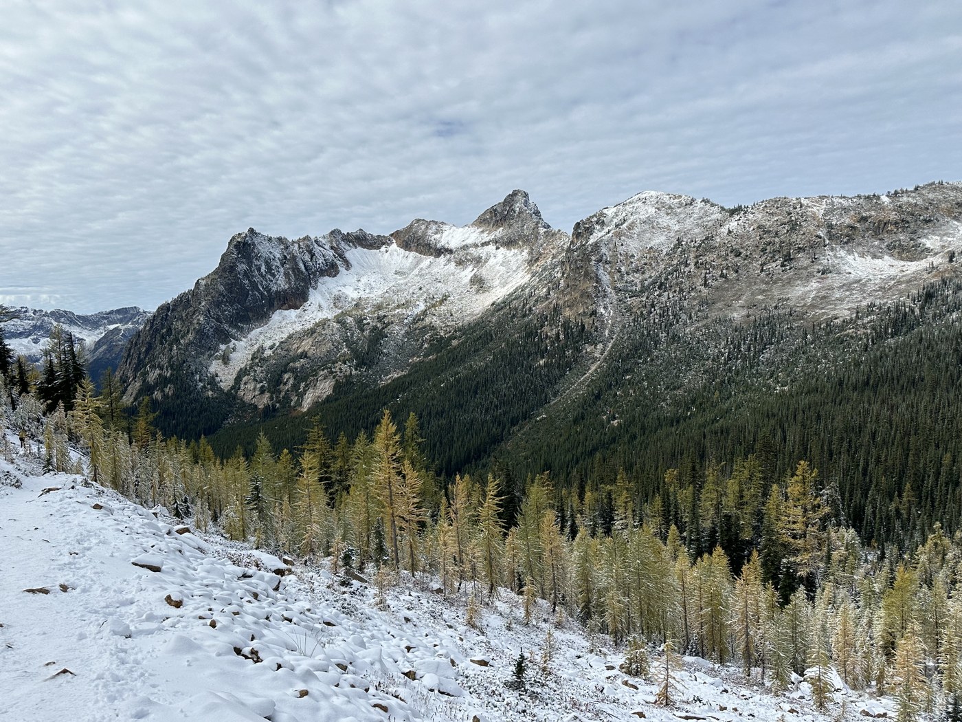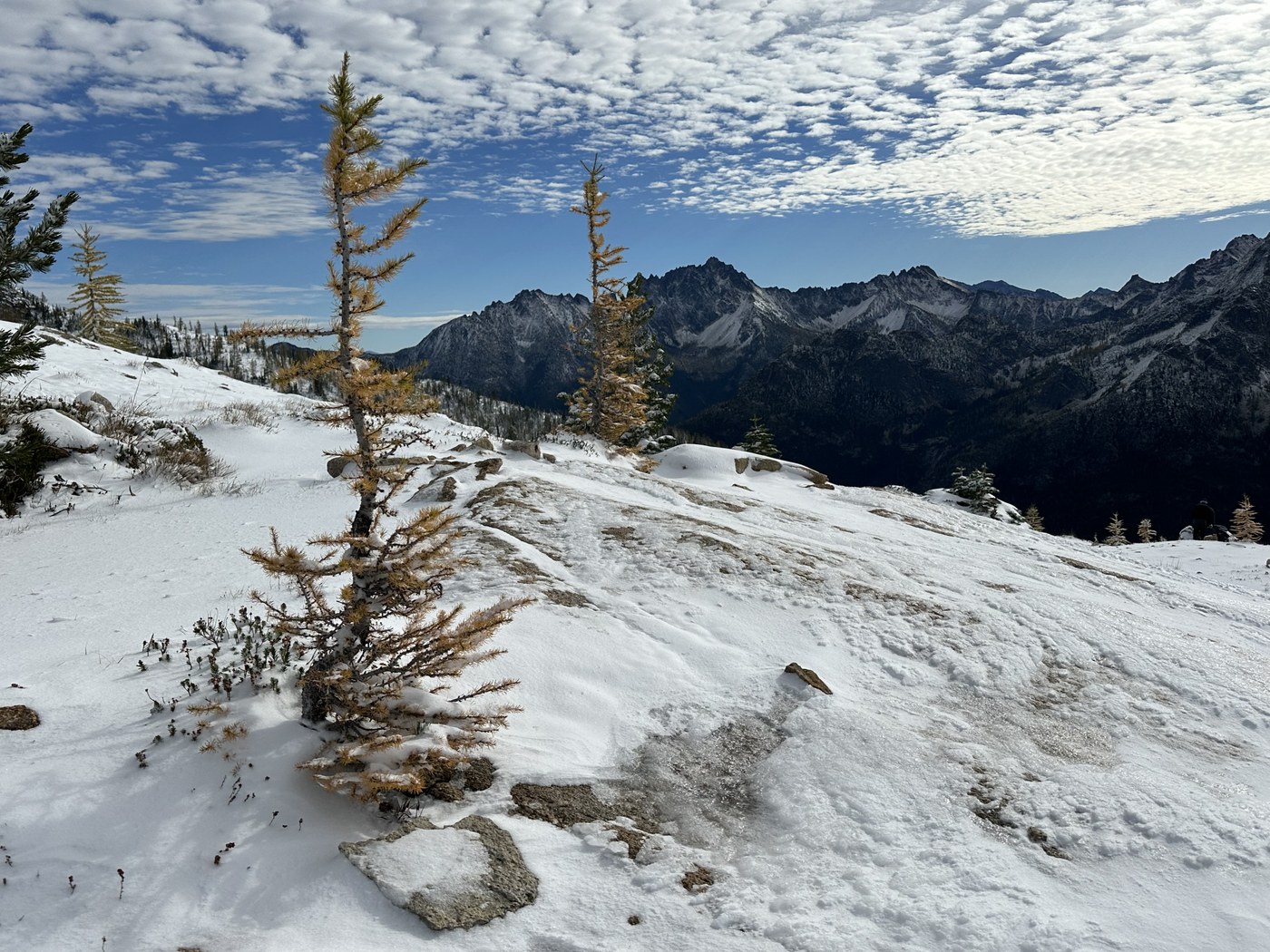 A 3:30 a.m. wake up call got me to the trailhead at 7:15 a.m. Got on trail by 7:30 a.m. water crossings were easy and snow began about 3 miles in. I didn’t need micro spikes which was a good thing because I didn’t pack them. (Note to self: micro spikes go in pack Oct 1 from now on) The snow covered the larches and most of the fall color.