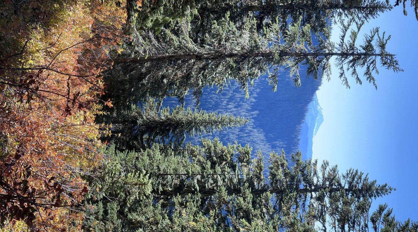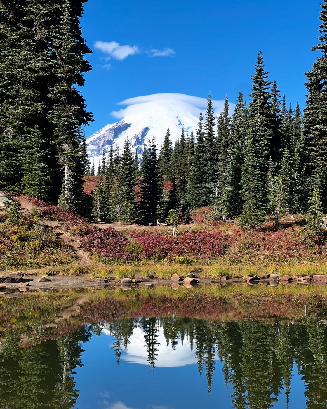 Beautiful fall day with the mountain out! Parked at Tipsoo Lake at 830am and parking in all lots was already full - the line for the restroom was also already a dozen people long - by the time we finished the hike the road was lined with parked cars and lots of people were circling waiting for a spot - get there early!