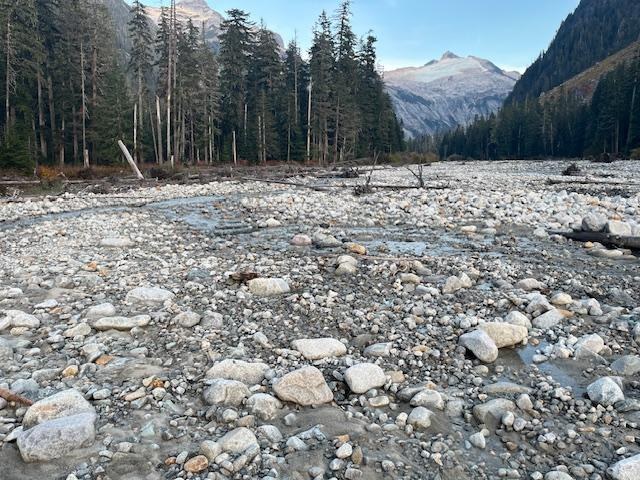 I had hoped to wade the multiple channels of the river and rocks to go far up the river to obtain the best views of Mt. Shuksan and the cirque. Luckily at this time of year, the water was only ankle deep to knee deep. Travel up the river is extremely slow, far slower than I anticipated. To do a mile over the boulders and crossing many channels took me far longer than I thought. I was not able to go as far as I wanted due to the daylight diminshing. With hindsight, I should have arrived far earlier. You can easily find many places to cross the river. Just wearing my Crocs was safe, better than watersocks since the rocks would be hard on your feet if just watersocks.