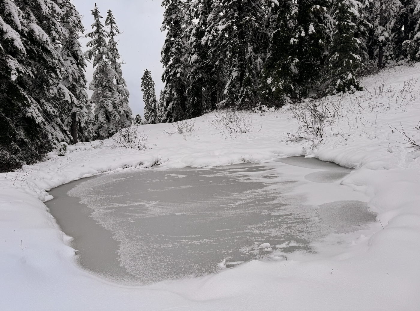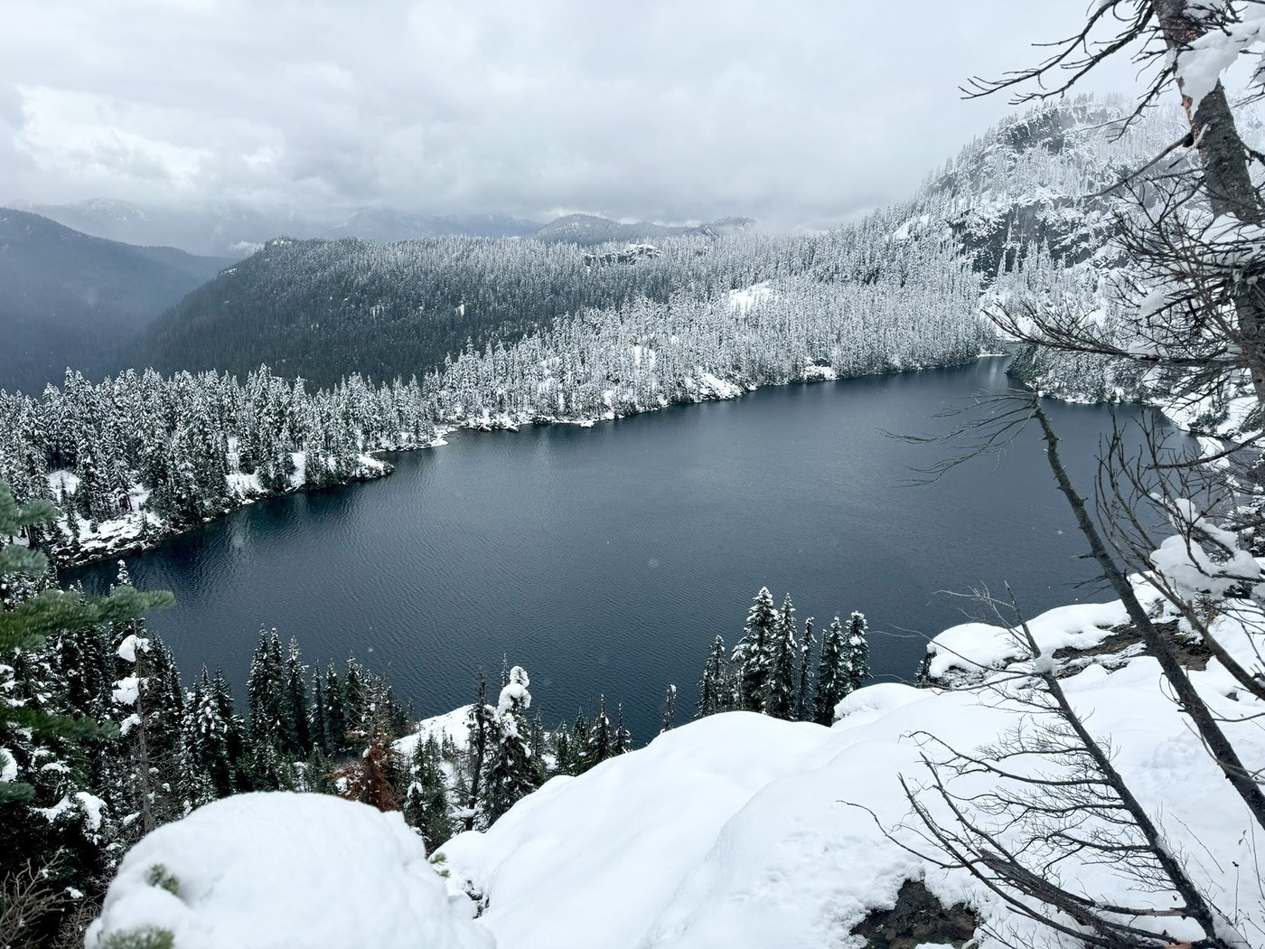 Was snowing lightly throughout our hike above Rachel lake. 12 miles round trip. We just ran into 2 other hikers on the day.