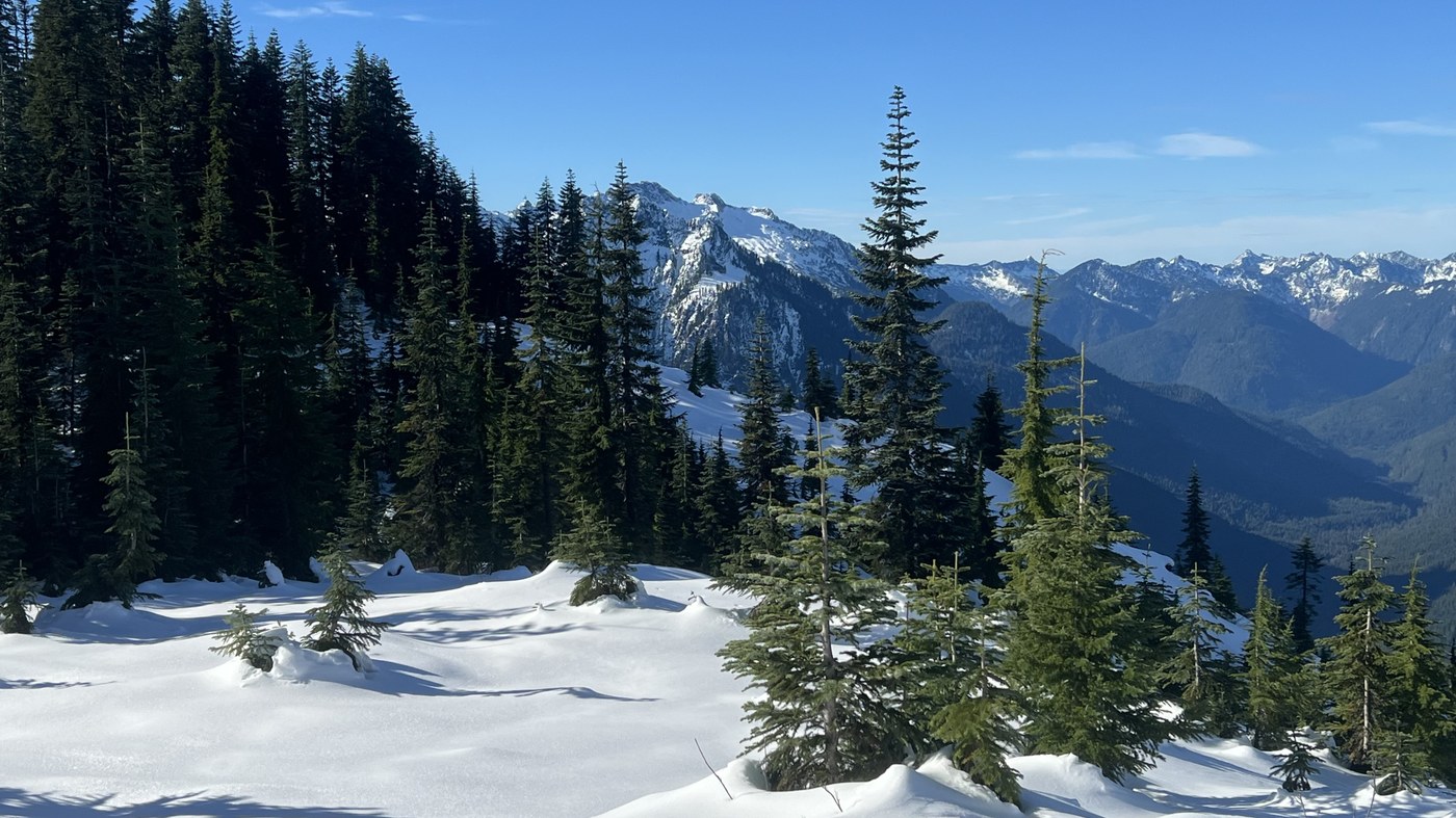 Fantastic day on Frog Mountain with Glen99! This is a great hike, as the trail is in super nice condition, and the views are awesome. There is significant deep snow up high on the flanks of Frog Mountain, but there is the beginnings of a nice bootpath all the way to the summit from yesterdays hikers. We had got a timely report from one of our hiking friends that they had broke trail yesterday, and didn't use snowshoes, so we left the snowshoes in the car. This worked well, as I only had a couple of postholes. We brought micro spikes, but didn't use them. This could change with the freeze thaw overnight. It's good to carry them, as you neve know. We both wore gaiters , which helped the boots stay dry.