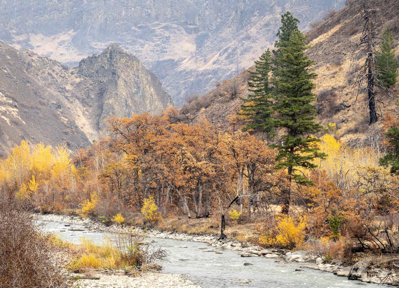 Ethan & I went to the Tieton River Nature Trail on this mostly cloudy, mild day, to see what it looked like after last summer's Retreat fire. We were also looking for fall color if there was any to be had. We started at the feeding station and walked up as far as the big meadow, where we had lunch under the giant oak. We stayed our usual hour or so before heading back. Though there was some sign of the fire, the color was very nice up to the suspension bridge, but from here on it was mostly desolation. A majority of the oaks seemed to have survived, but most of the cottonwoods, aspens, douglas firs, and even ponderosa pines, as well as all the understory, were torched. The ground was gray and black and still smelled of charcoal and ash. Despite this, there were many signs of regeneration: new leaves at the base of the burned oaks and rabbitbrush, new shoots of wild rose, and aspen suckers. At the big meadow, many of the aspens on the south side survived, but most of the trees between the meadow and the river were burned. The big ponderosa pine in the middle of the meadow had fallen over and burned, but the big oak survived. Above the suspension bridge there were a number of blow-downs, but they were all easily stepped over or walked around. There were quite a few others on the trail today, especially between the feeding station and the suspension bridge. It was a sad sight, almost like being in a new location. It will regenerate, of course, and even by next year will be a nice walk, but it will never be the same, at least in my lifetime.