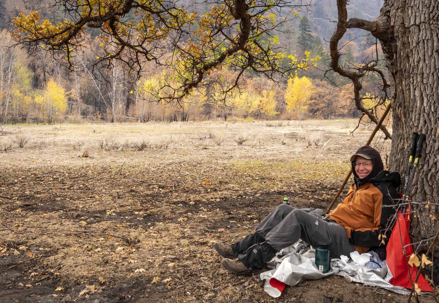 Taking a rest on a chilly day with your back against a trunk — that's trail life for ya!