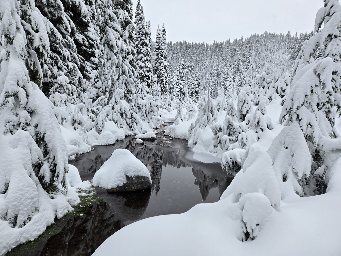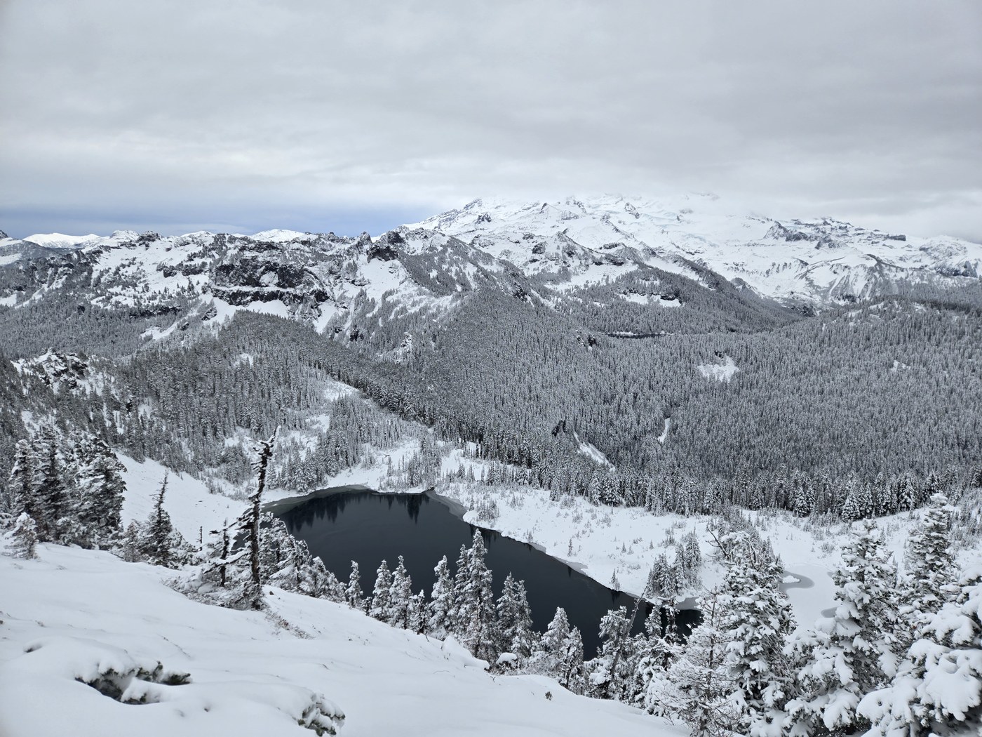 Parked at the Carbon River Trail Trailhead. Road in good condition. Snow started between 3500' and 4000' and increased to 2 feet deep by 6000'. Tolmie had more snow than Florence Peak. Snowshoes were needed above 4200' in open areas and above 5200' in the forest. We followed the ridge off-trail from Florence->Howard->Tolmie which was not too difficult even in snowshoes. Storm started hitting at 1pm when the wind and snow picked up. Once we were below 3700' it changed to heavy rain. Since Mowich Lake Road is closed we saw no one at these more popular summits.