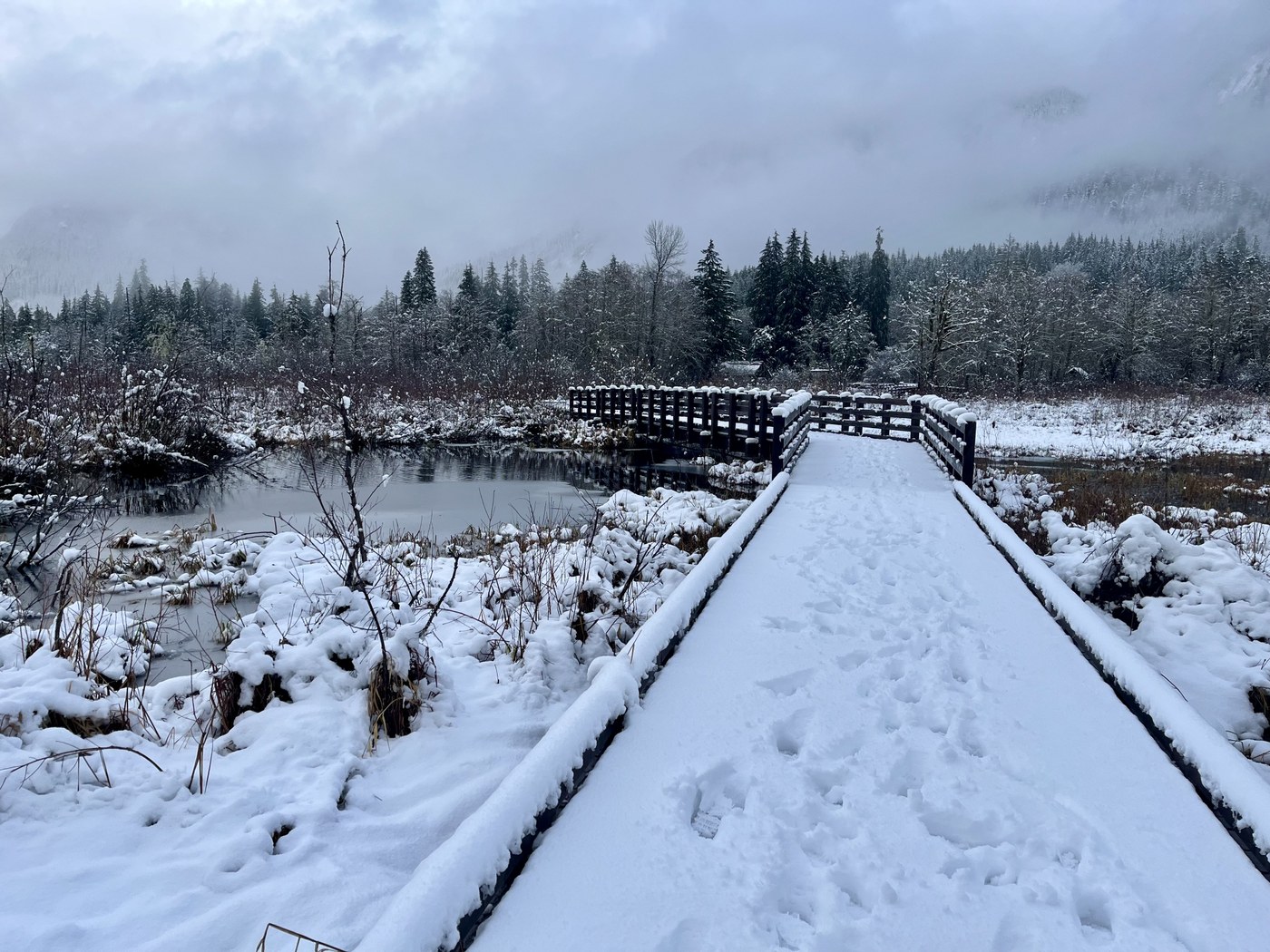 The trail itself was snow covered from start to finish. Just a couple of inches at the beginning and 8-10 inches at the caves. Foggy and lightly snowing most of the way.