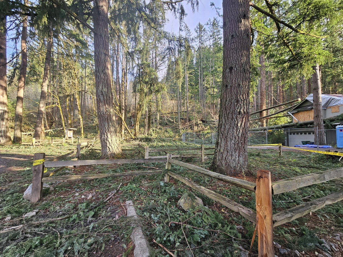First time out this area since the big storm. We didn't have it so bad in the South Sound away from the trees. We arrived at the E Sunset TH and were amazed at the damage. The poor people living at the base of the mountain! At least two residents were displaced. One person was packing belongings into a U-Haul. The back end of the lot was closed off and the trailhead was moved. Small trees were tagged with pink ribbons to protect them and direct traffic.