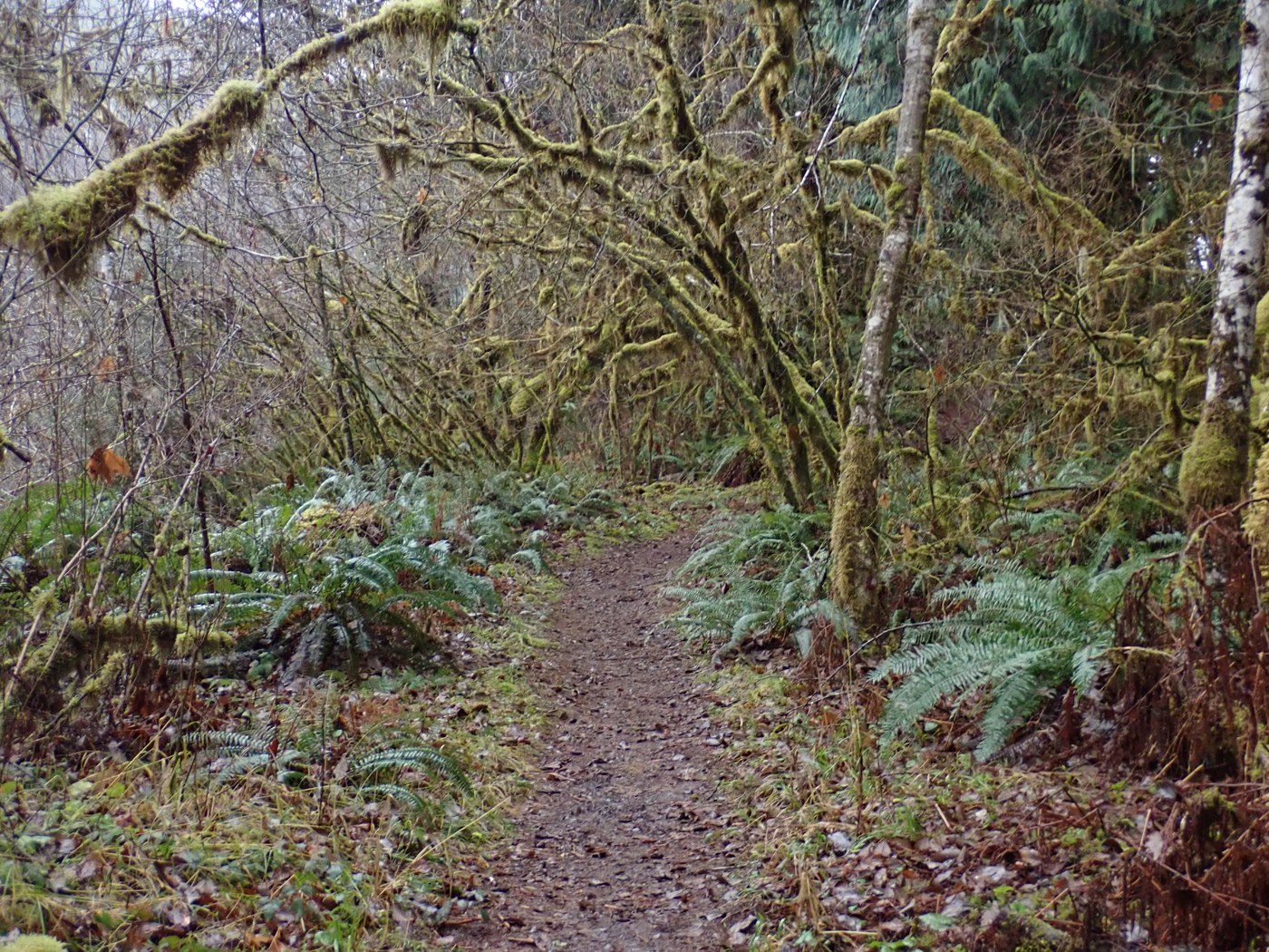 A wet one today, but if you don't hike at least once in the woods in the rain you're missing out. The trail is in great shape all the way to the west end parking lot, no blowdowns and very little mud. We didn't see any big, exciting wildlife today, but we did see a couple of salmon spawning on one of the little side channels so shallow that they were halfway out of the water in spots. We heard an eagle, saw a water ouzel and ducks riding downstream on the fast river current. There were deer tracks in the mud and what looked like a cougar (not Cougar) prints following behind, and we smelled a skunk, does that count for wildlife? Most of the moisture was a steady drip off the trees, we avoided a total downpour. We took the ADA trail back, it's in good shape, but you would probably need a power chair or really strong arms to do the whole loop. We had the trail to ourselves. Road bare and wet all the way to the TH. Loo open, clean and stocked.