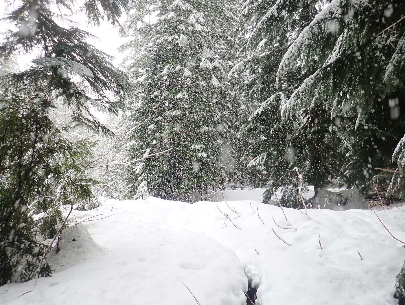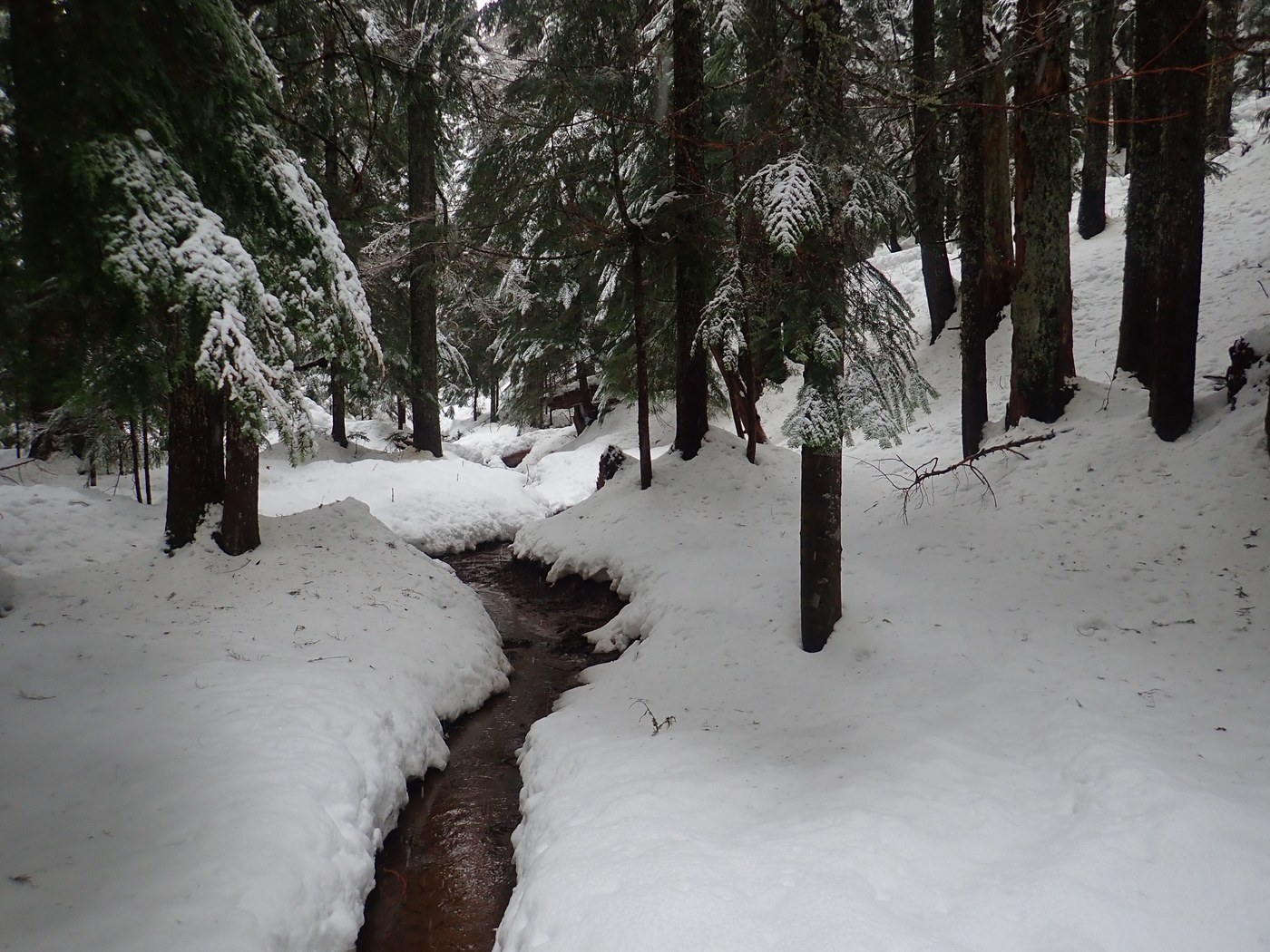 Gold creek today was... Wet. Morning wet rain so the surface became slushy, but people were in boots midday and the road has not been groomed. Boots were gone by Heli's pond, and only a ski track and single snowshoer prints past the gold Creek trail sign. Thank you snowshoer for continuing a bit past the log crossing, I would not have made it as far without your footsteps.