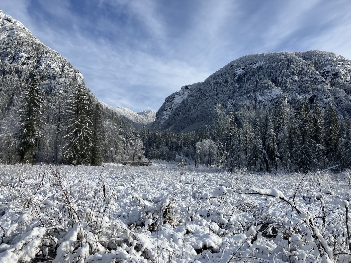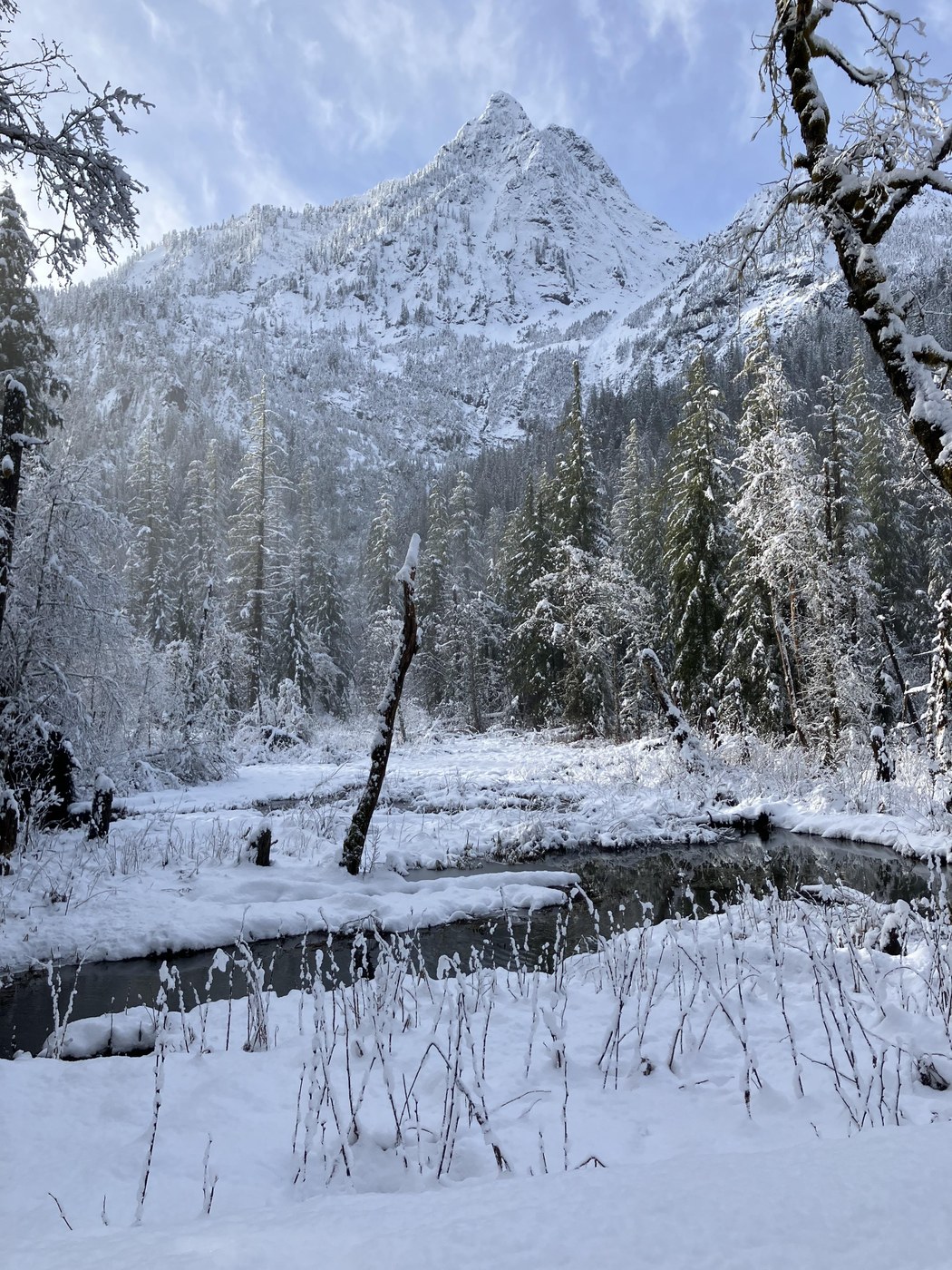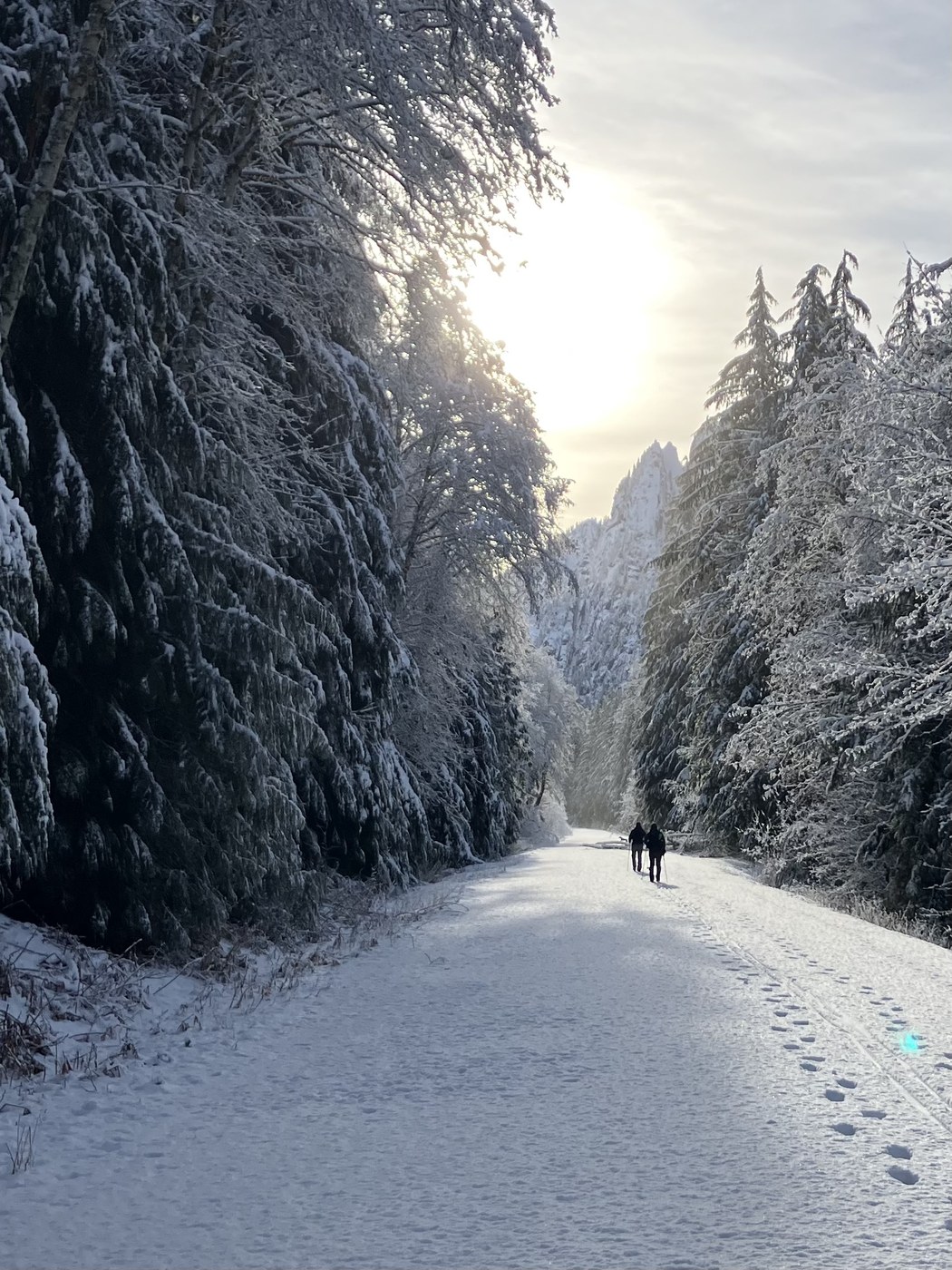 Solid snow on the road past Lake 22 Tuesday morning. Not plowed yet, so a bit more driving adventure than I had expected (some large branches and a couple of trees to navigate around). Parked at the gate and hiked to the picnic area and back. About 3-6” of snow on the road to this point, so a big change from a few days ago. Had microspikes in the pack, but got by with boots and gaiters. Snowshoes may have been useful closer to Barlow Pass. Solid coverage for the XC skiers.