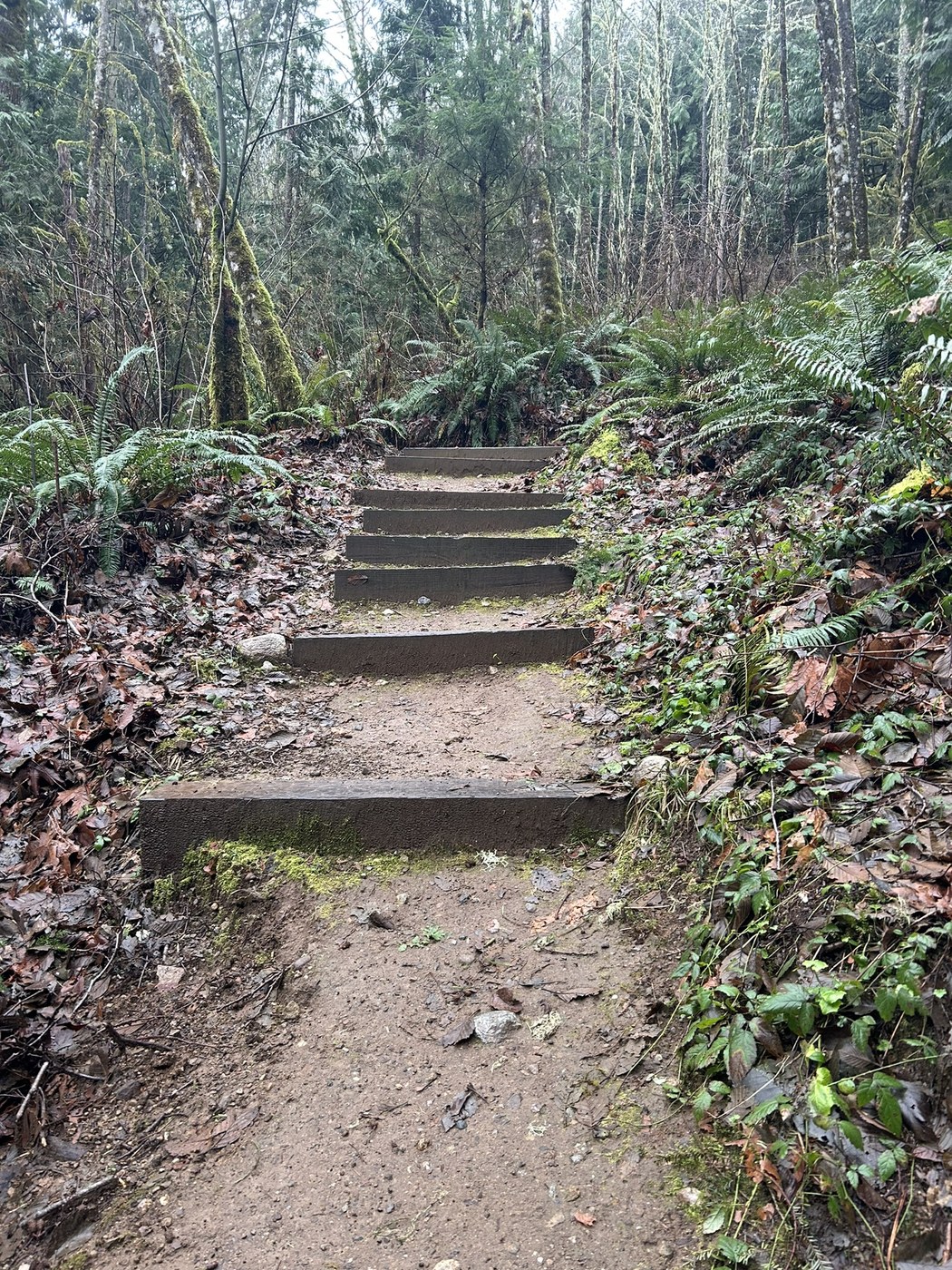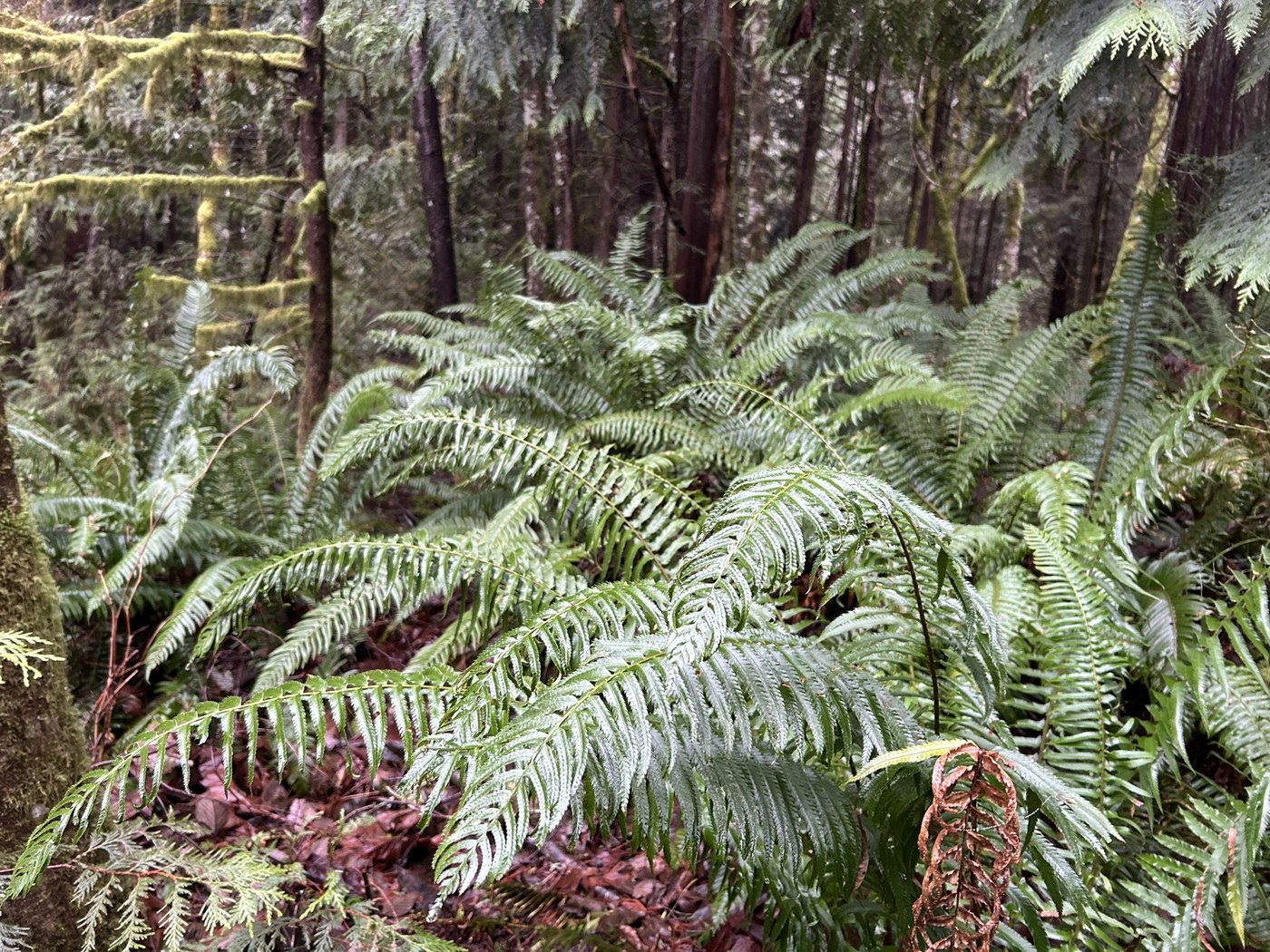 Highlights were a massive grove of Douglas fir on the way back down, abundant sword fern, and a very close hairy woodpecker foraging on the Doug fir bark.