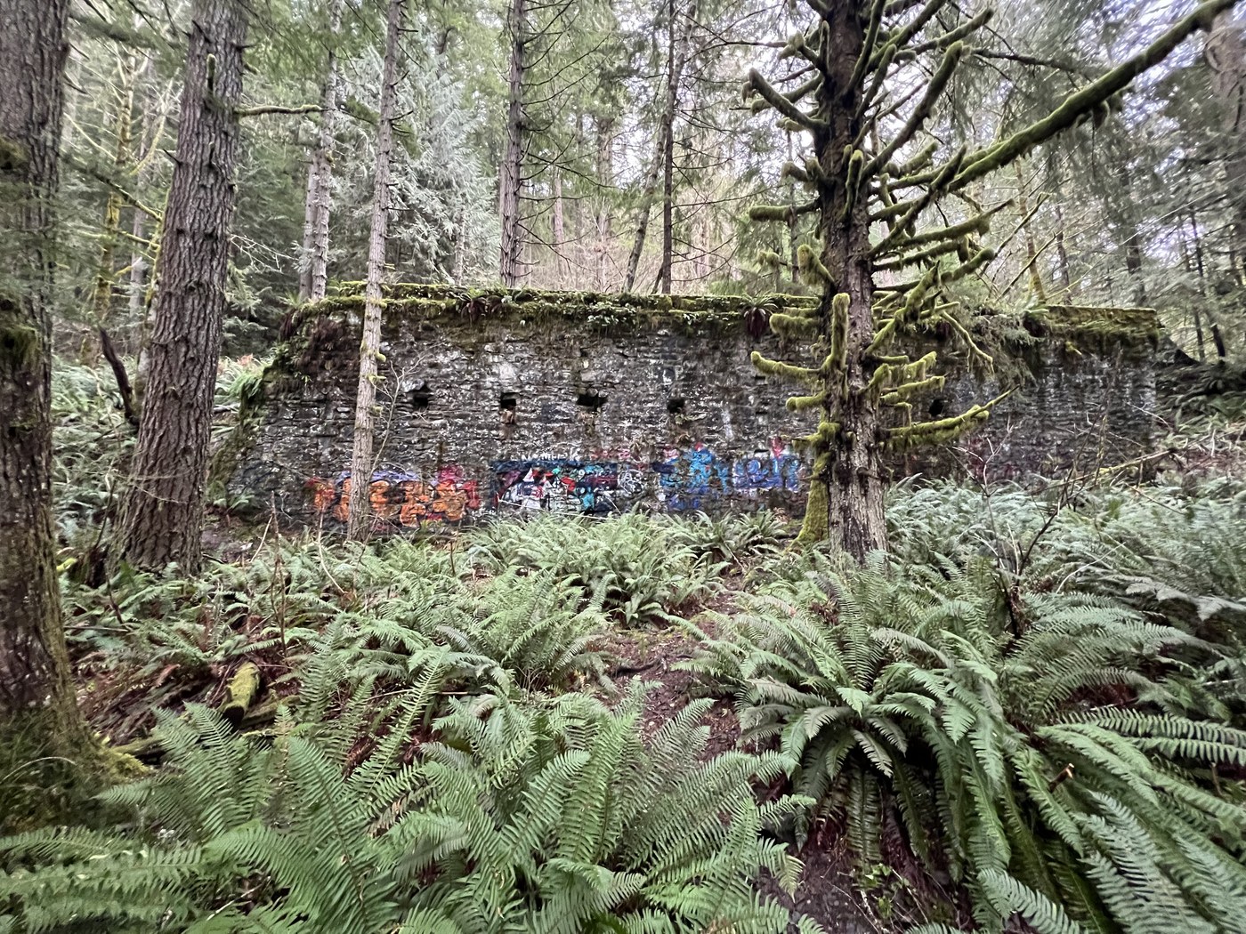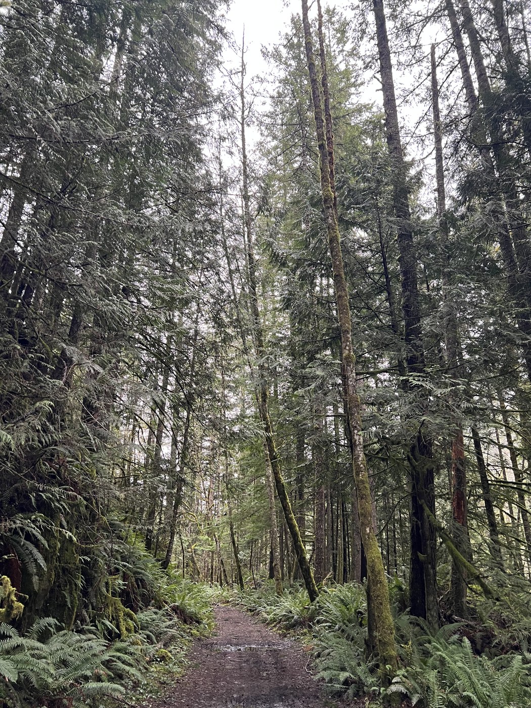 Mother Nature blessed us with sunshine and unexpected precipitation: a rain shower, hail, and finally, light snow. Moritz was especially pleased to see the snow. The main trail is wide, flat, and easy to navigate. While there is some mud, loose rocks, and two fallen trees—typical for trails at this time of year—it is perfect for clearing your mind or walking with those who may not be avid hikers. The forest is gorgeous, and there are several opportunities to glimpse the river below, along with a nice old bridge. Like Twin Falls, you'll need to tolerate the occasional incongruous noise from passing vehicles on SR 165 above.