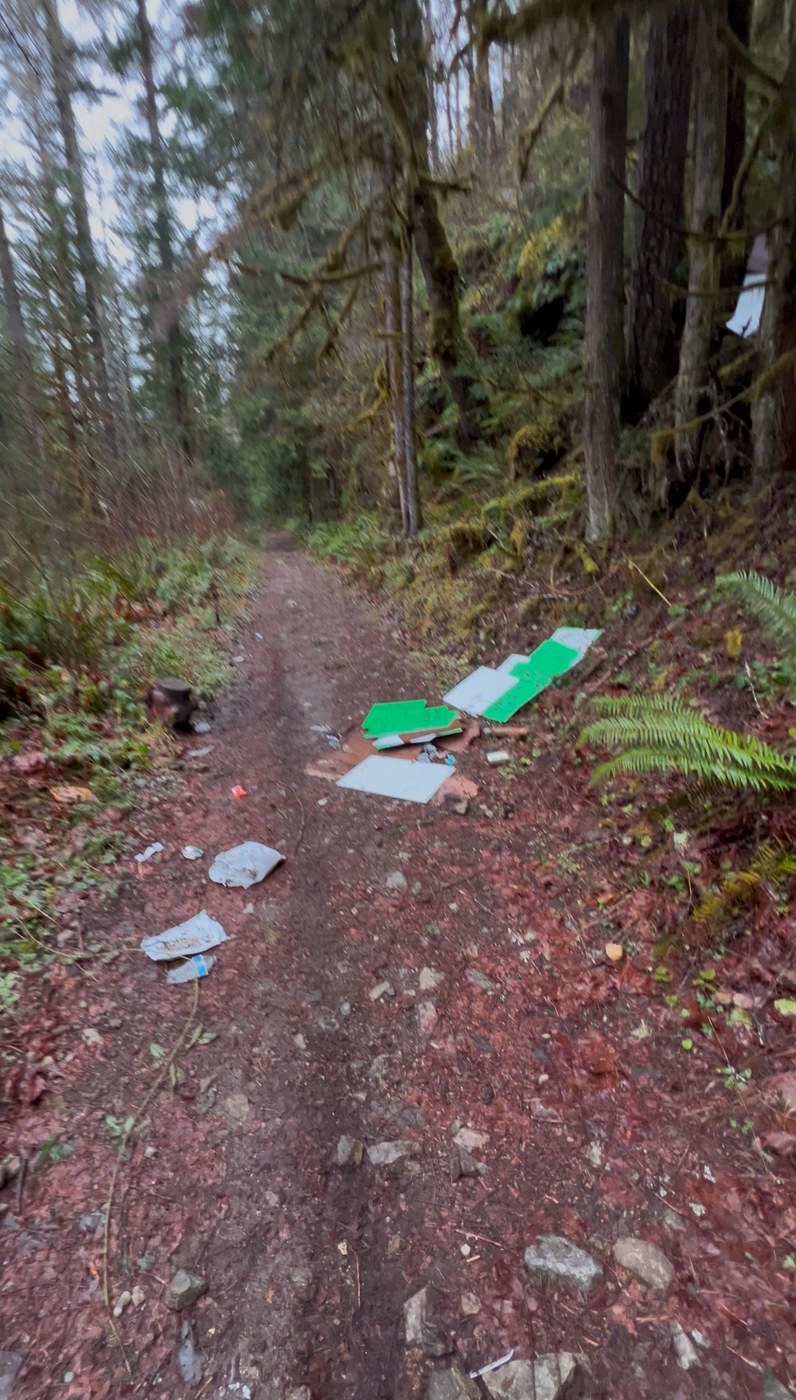 At one point along the main trail (47.04642° N, 122.04289° W), there was a considerable amount of garbage, probably from the nearby highway. Most of it was made up of yard signs and furniture, but there was also some organic waste. I marked the spot so I could return later to clean up what I could.