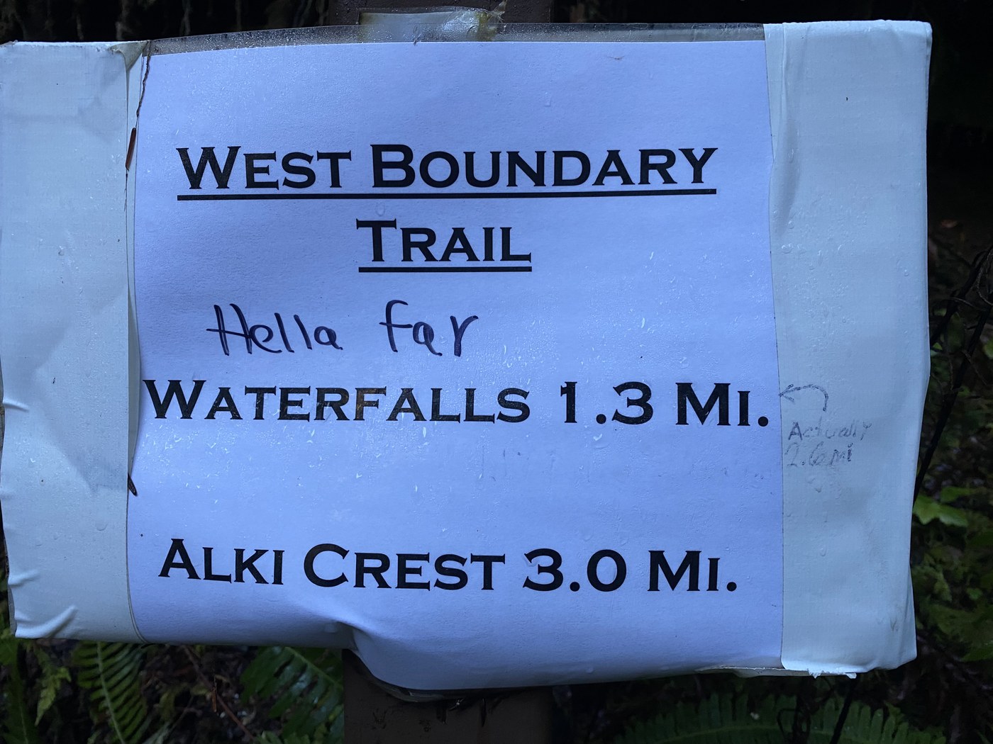 Overall gps distance was about 5mi (with some occasionally route finding/snow detours). The janky sign at the beginning of the boundary trail is misleading- it says 1.3 to waterfall and 3.0 to Alki Crest. I had 1.8 to the waterfall and 3.6 to the start of Florence Peak trail. (All the maps I’ve seen show Alki Crest being 0.7 mi SE of Florence. Does it really encompass the whole ridge including Florence peak?)