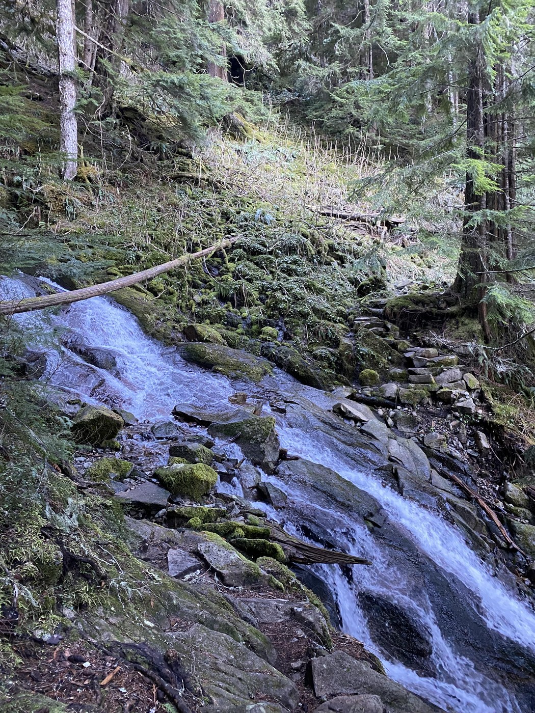 Waterfall crossing is doable, but be cautious and don’t trust that the rocks are stable. If it was below freezing and there was rime ice on rocks around the falls, I would have turned back.
