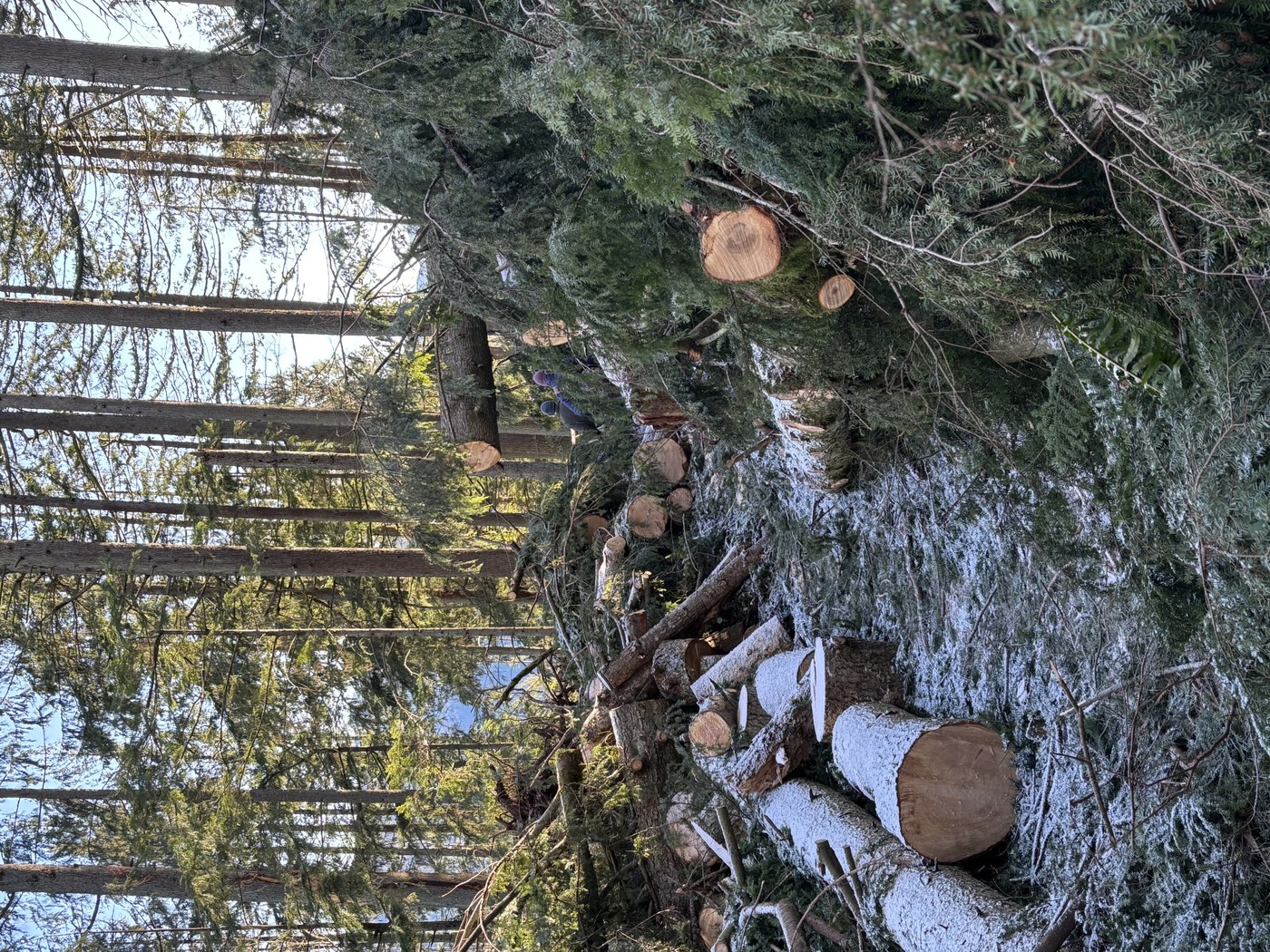 A lot of work has been done but Old Griz trail is still a mess! The trail is currently closed. On Saturday, Issaquah Alps Trail Club and Washington State Parks led a volunteer work party to cleanup some of the debris from the November cyclone. Massive tree fall with logs jumbled in piles and gaping holes where trees were uprooted will make trail restoration difficult. State parks has been busy chain-sawing a path through the downed trees. The volunteer work party cleared smaller debris using hand tools. We made significant improvements but there is a lot more to be done.