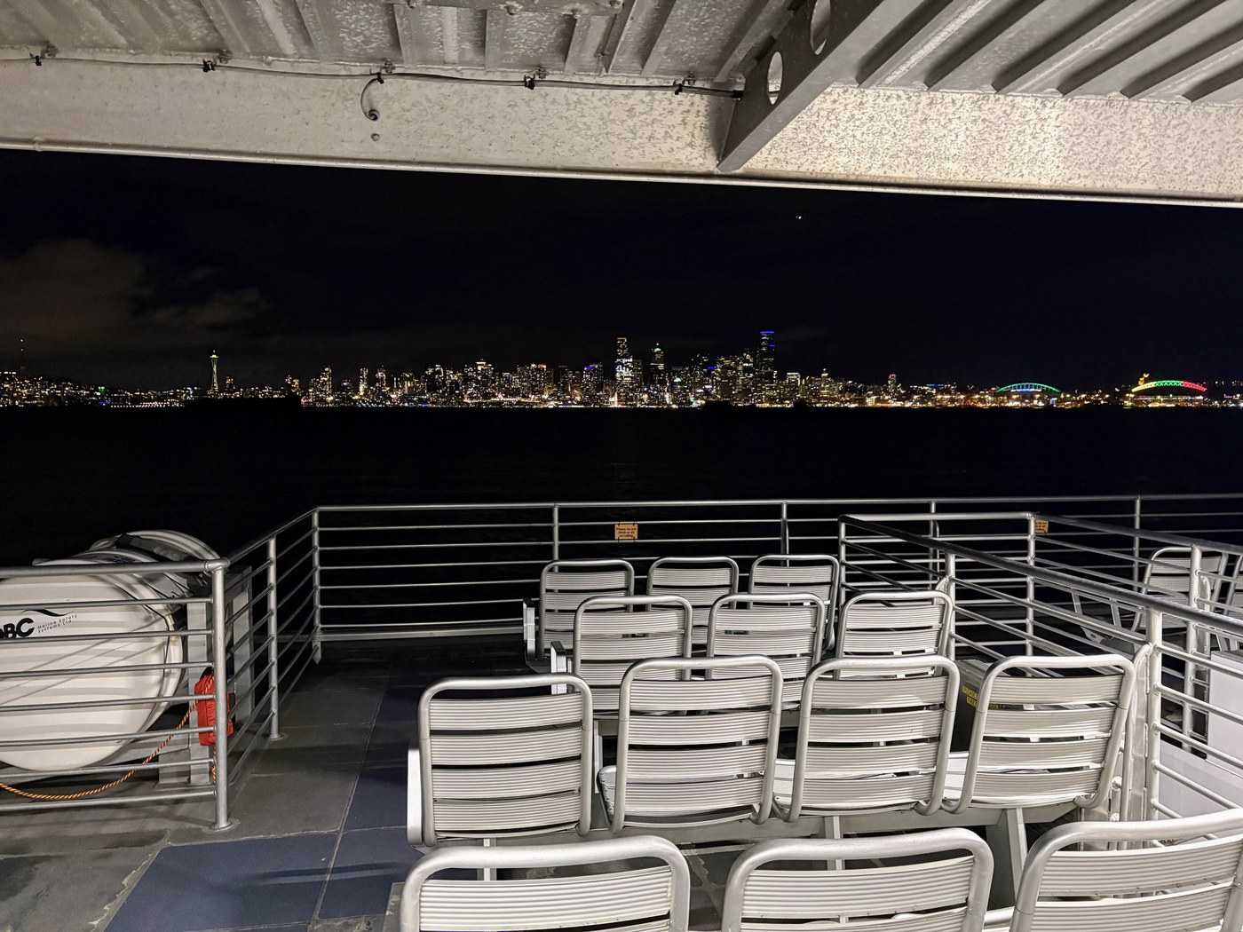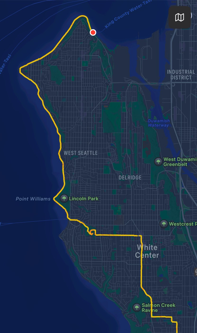 The stretch between Lincoln Park and Alki contains several small parks and beach access points where one can enjoy the lapping of Puget Sound away from the crowds at the major West Seattle parks. These afforded me some dazzling prospects of Vashon, Blake, and Bainbridge Island as the sun continued to drop. I then skirted past Alki Point and onto the trail that took me all the way to the West Seattle Water Taxi terminal, with a brief stop at the always surprising public restroom at the Alki Beach Bathhouse. I reached Marination Ma Kai at the water taxi terminal just shy of 13 miles into my hike. I ate a hearty meal while waiting for the next departure. The view from the boat ride across Elliott Bay came up in the clutch as always, and upon landing on the downtown waterfront I was right across Alaskan Way from a RapidRide C and H stop. This turned my one-way hike into a highly convenient loop.