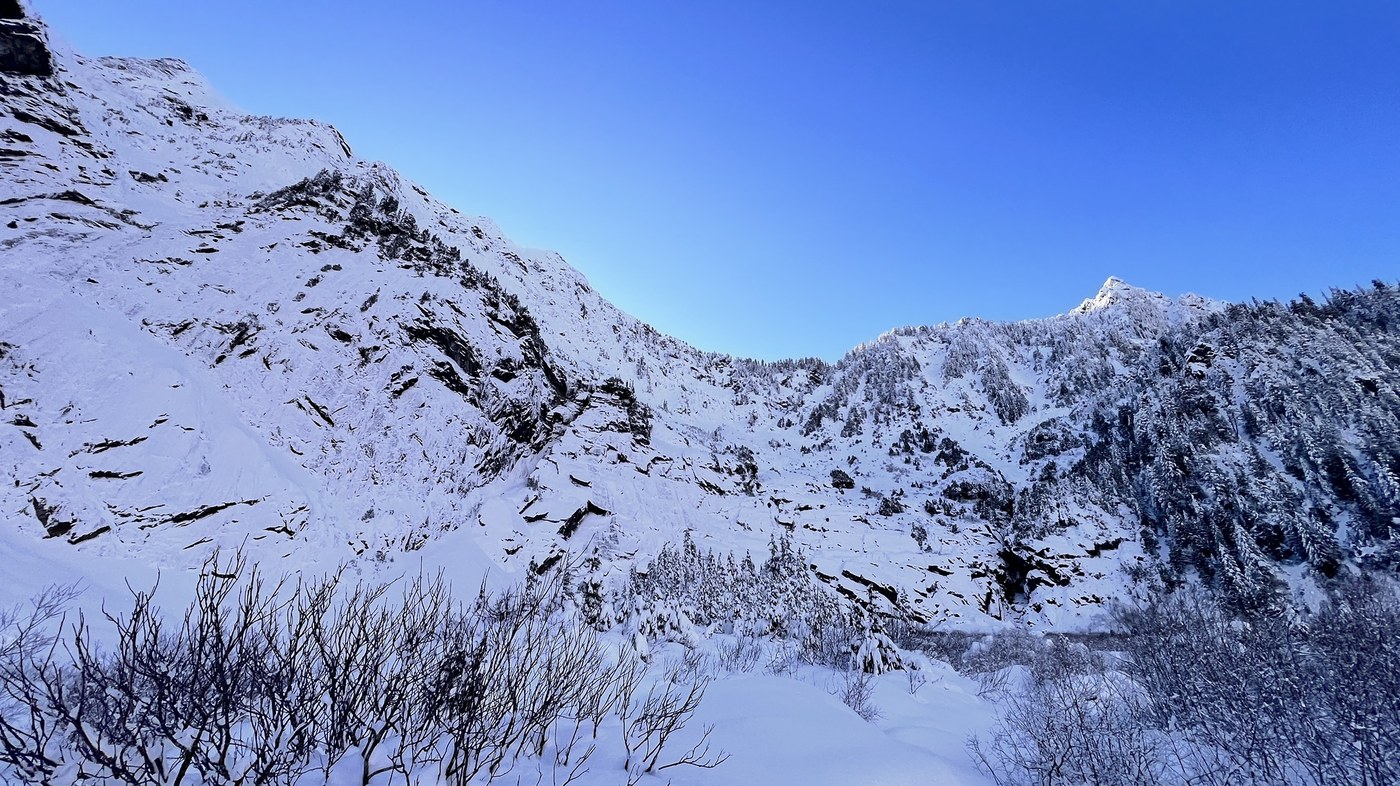 I stopped just short of the “end” of the trail since I had a strict turn around time and breaking trail really slowed me down. I enjoyed a snack while listening to and watching a few ice falls from a safe distance.