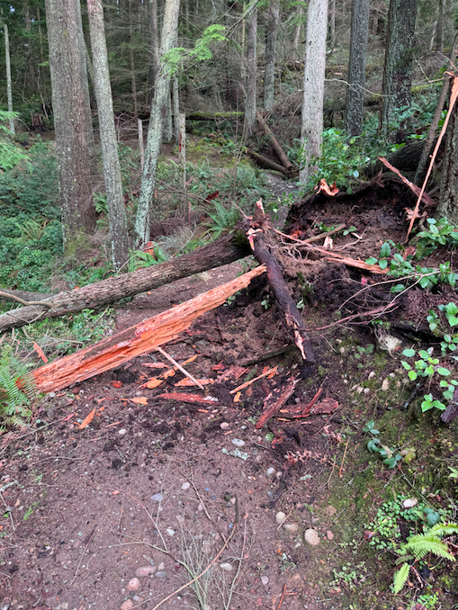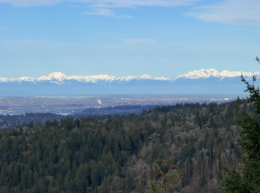 Interesting hike the day after a wind storm. It was more like an obstacle course than a true hike. There was lots and lots of debris down, and some trees. Only one tree had to be stepped over, otherwise you were winding your way through the branches to get by. Fantastic views of Mount Rainier and the Olympics today. Very little mud.