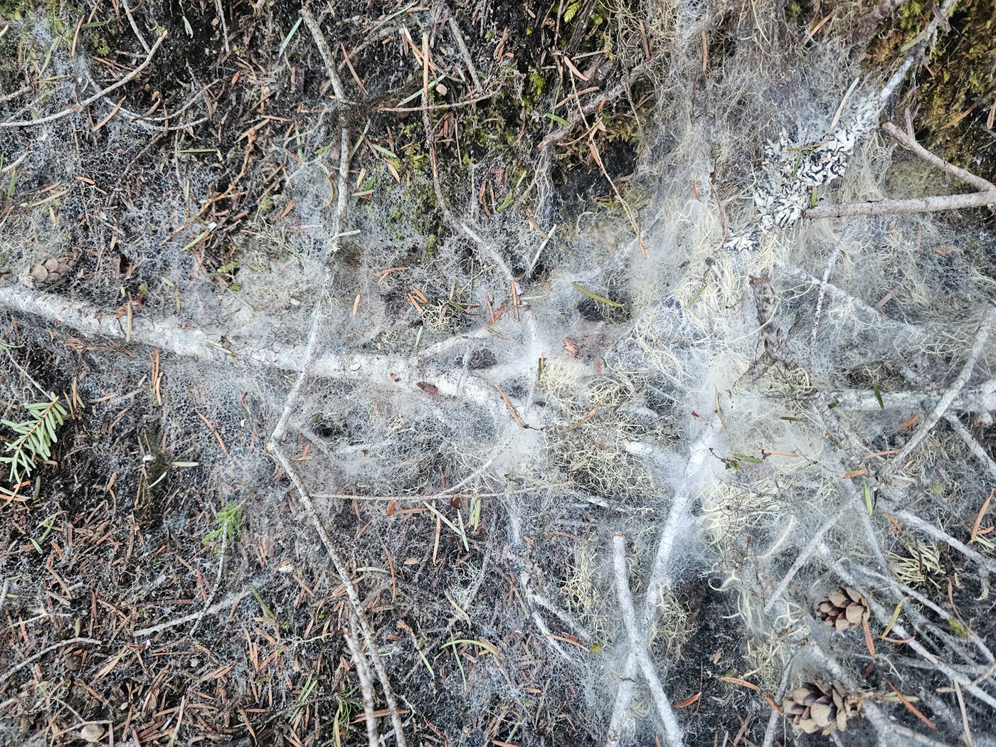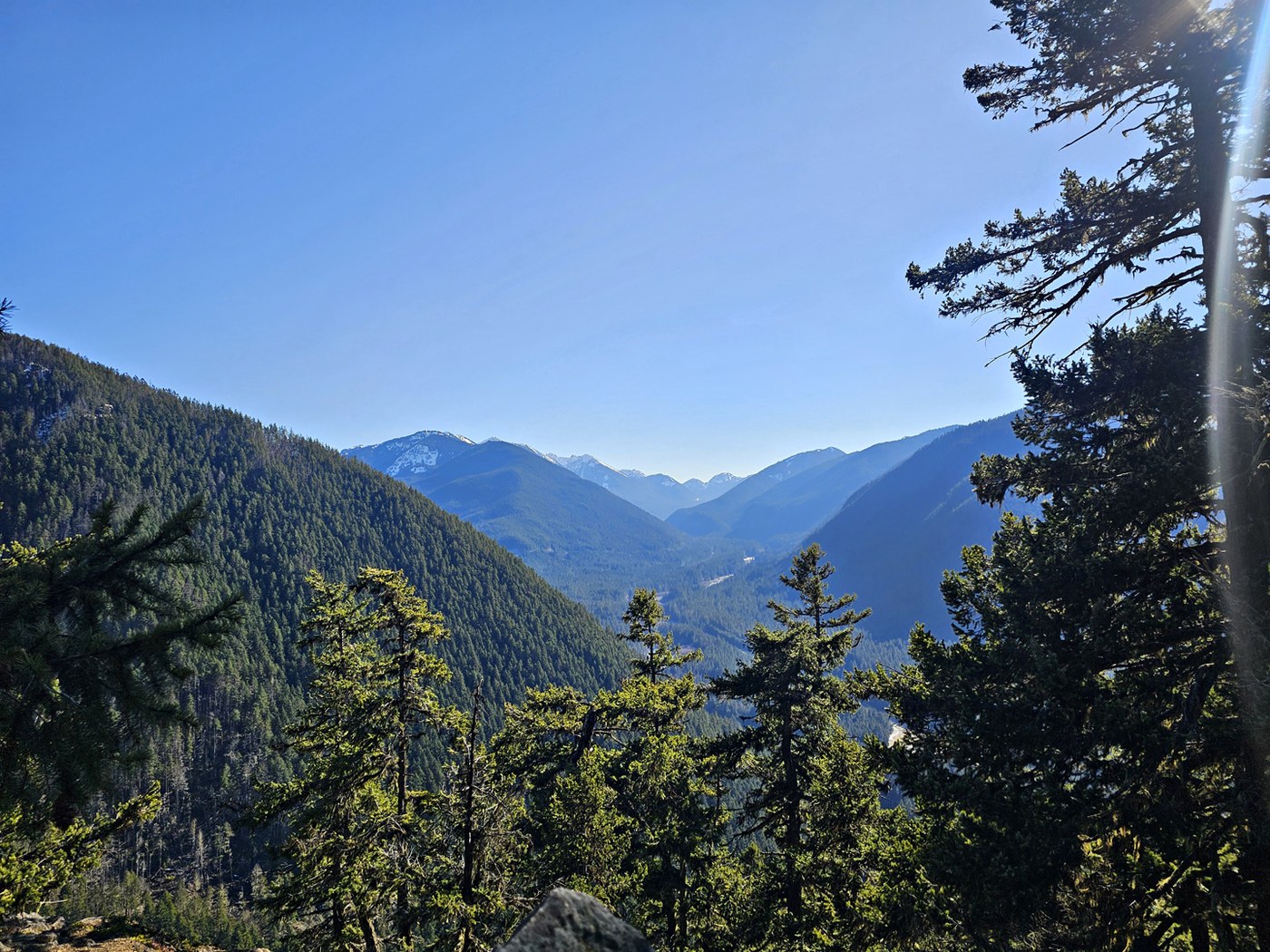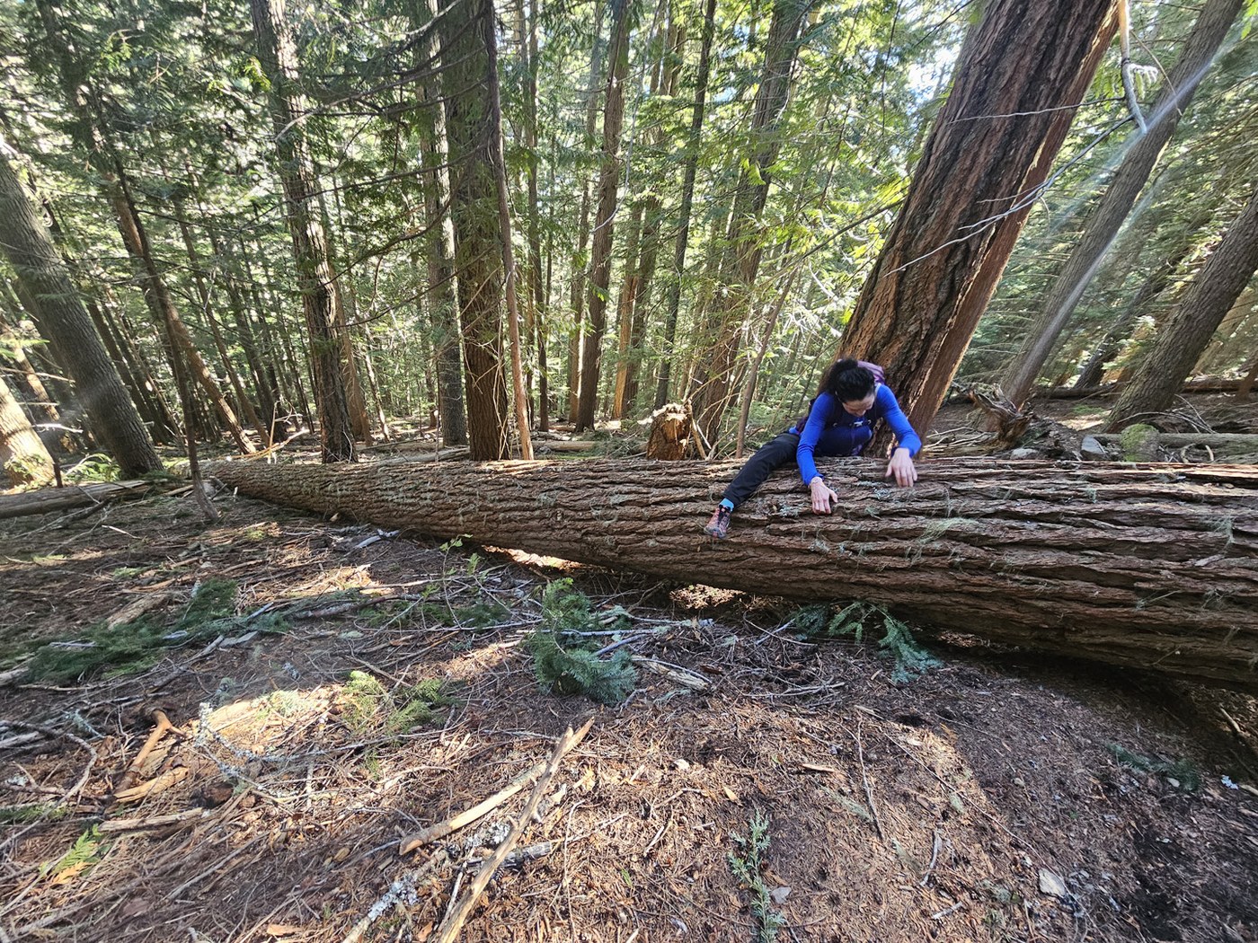 Midday start under blue skies from the spot on the side of 410. There were 2 other cars and we saw both of those groups within the first 1.5 miles, then had the trail to ourselves. Trail up to the viewpoint at 2.9 miles from the car was in great shape, aside from the very defined biker shortcuts. Not even mush debris on the trail. About 500 feet up from the viewpoint is a downed tree which can be crawled under or climbed over. 0.3 more miles up lies a bit messier problem. There's a downed tree about a foot off the ground, so you can't go under, and big enough you can't step over. It's very long so you can't go below the trail to cross with any more success. And it's on a steep pitch. There's is solid bark to grab onto and climb over though. There were a lot of branches from a second tree, but I dislodged and cleared most of them.