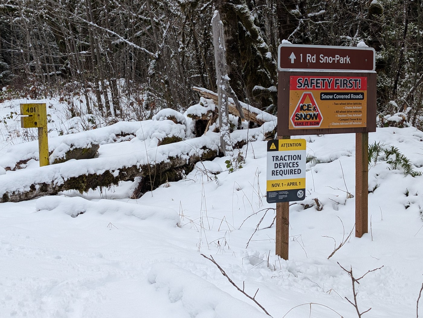 Road 1 was very slick all the way to the trailhead. Chains or traction devices required. They are rentable in Ashford at Whittaker's or the gas station while supplies last. Try them on to make sure they fit and put on early BEFORE you need them. The trail was icy just off the Highway turnoff. Have the 10 Essentials as well as emergency gear and rations in your vehicle. You must have a printed and completed snopark permit to park in the snopark.