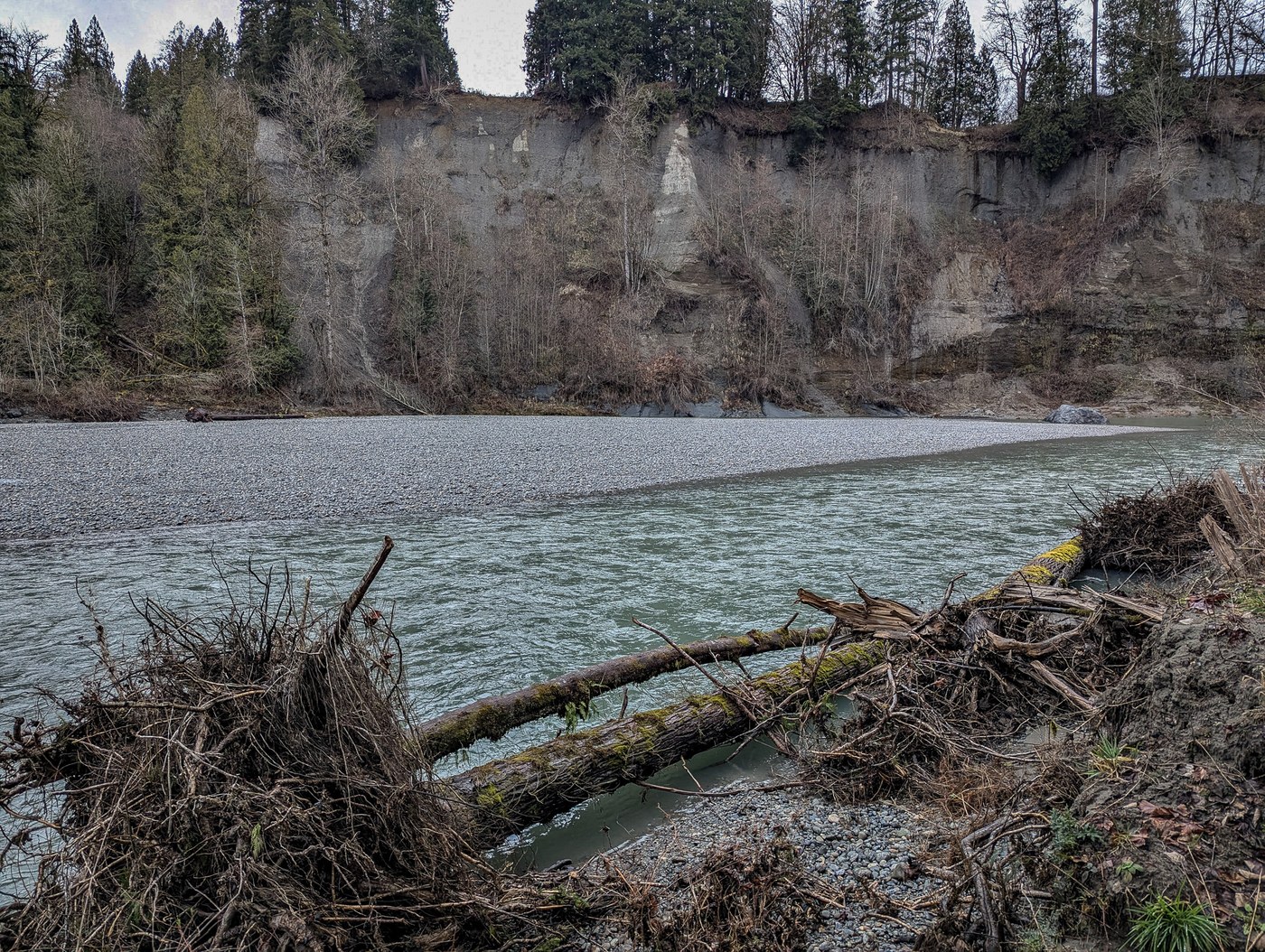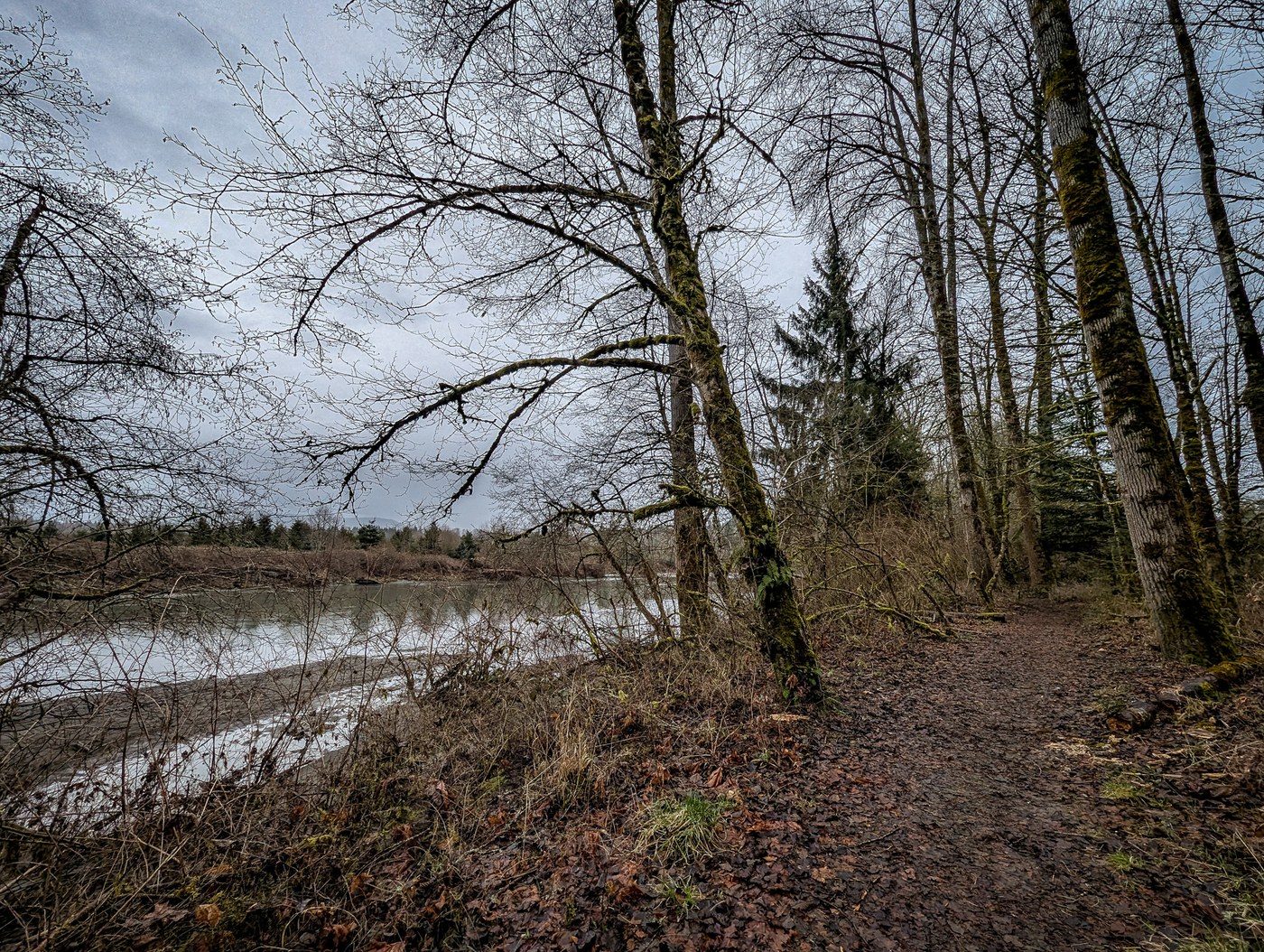 This was a good choice on a dreary day. We walked about two miles starting from the day use parking area then following the trail along the river. Eventually we reached a point where some scrambling up tree roots was required to continue. From there we veered right and went through the yurt area and back down to the parking area. We walked a little farther the other way along the river past the tent camping area. There were some muddy areas but not too bad. The restrooms at the day use area were closed, but there was a porta-pottie staged next to the building.