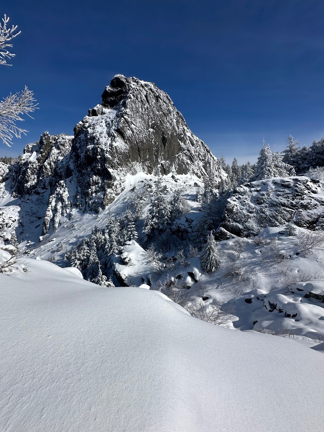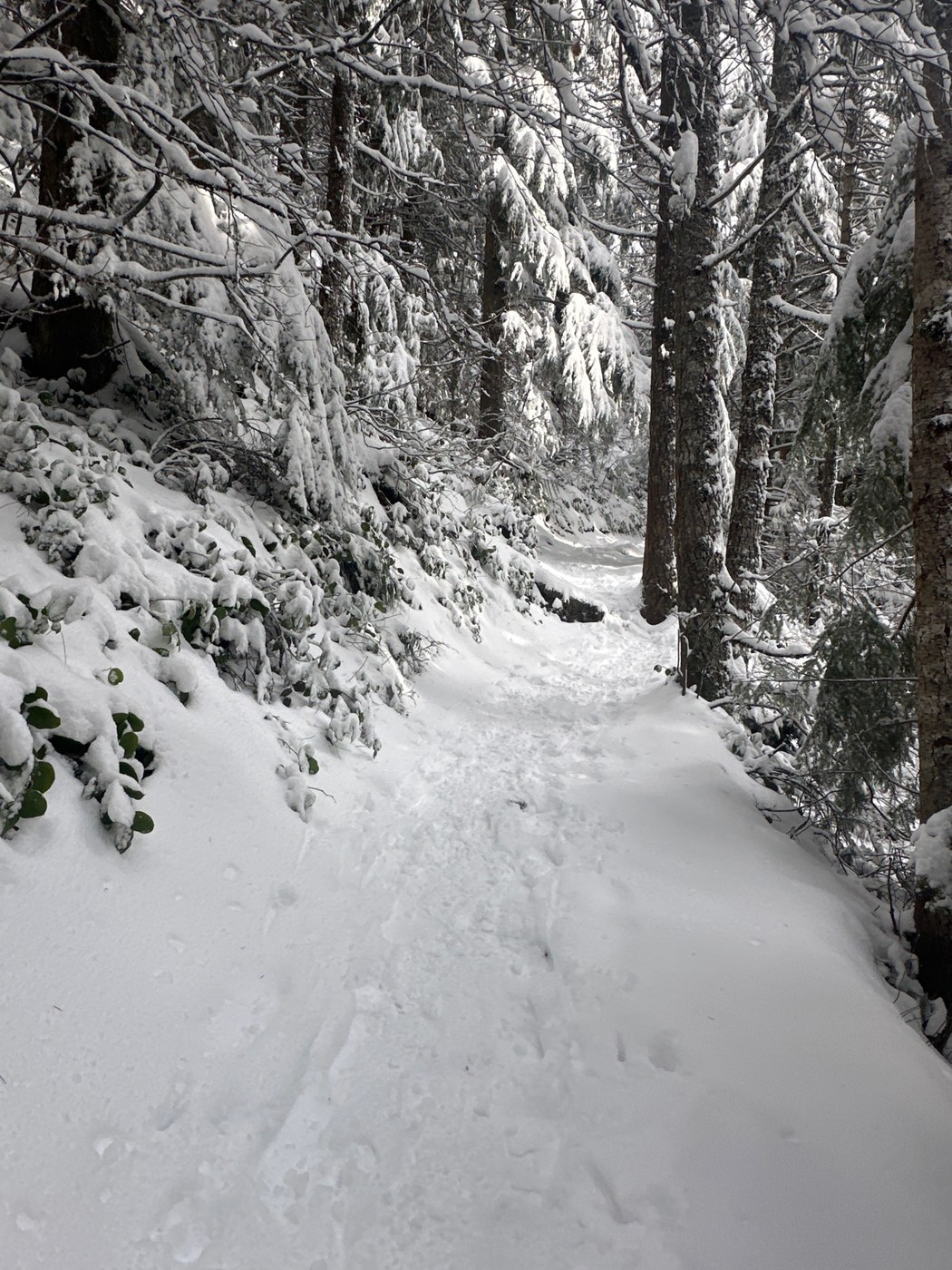 The two prior days of precipitation left a nice powder cover of snow on ground and trees branches. Morning sun and wind created a lovely gentle "snow fall" off the branches on the way up. However, by 1030. the warming sun turned the snow on branches to ice. On the way down, I was regularly pelted with falling small hail pellets and occasionally a slushy hail "ball" that really hurt when it hits your head (ergo: wear a hat). The slushy made micro-spikes more important for farther down the mountain.