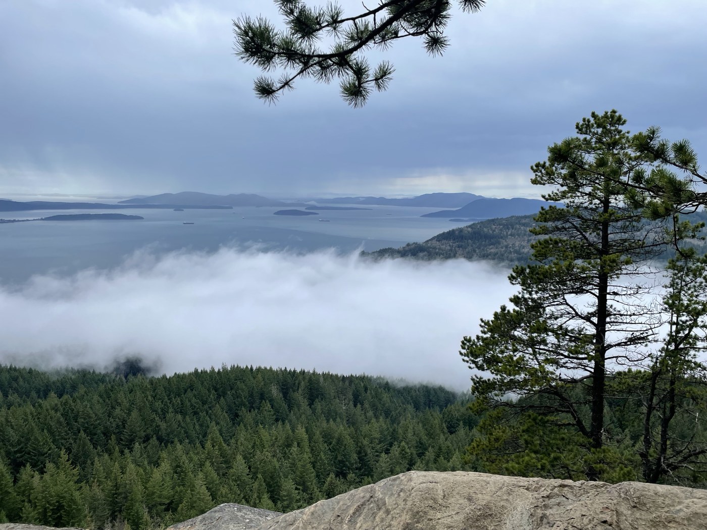 Started the Oyster Dome hike from Chuckanut Drive along the Pacific Northwest Trail entrance in a dimly sunlit/overcast around 930 am and climbed into a fairly thick misty fog which cleared for a mile then started lightly raining before becoming windy at the Dome itself which blew the clouds away to reveal a wonderful view. Walked back through several different weather conditions before driving home in the mist then walking my dogs around the neighborhood in Mount Vernon in brilliant sunshine and 65 plus degrees!