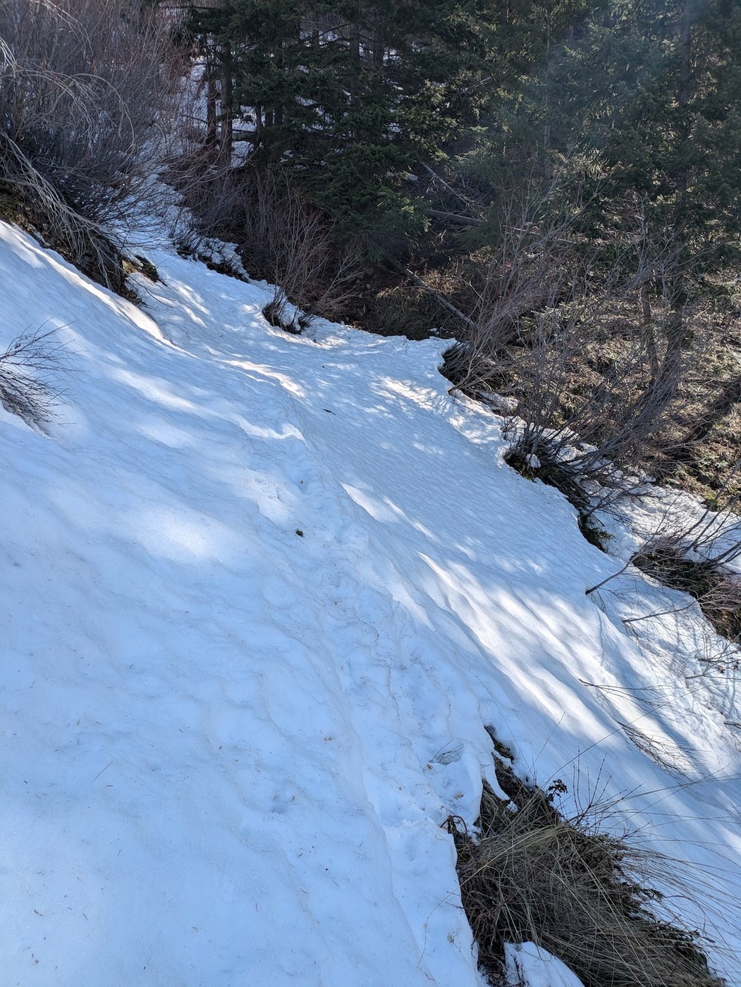 - Trail Snow: A handful of sloppy snow patches that are easy to walk on/in during the first 0.5mi until you cross Fourth of July creek the second (and final) time. From there the trail is predominantly dry until you transition onto the west-facing slope of the draw around 3900ft. From here the patches of snow start coming back and are firmer, requiring more careful foot placement or kicking steps. This becomes especially true as you get into the narrow side drainage around 4400ft (about 2.5mi from the car), which is where I decided to turn around for the day. The issue is that the sun doesn't hit this area until mid-afternoon which briefly softens it up before it refreezes into a hard ice surface overnight, making it challenging to hike in the morning or even mid-day.