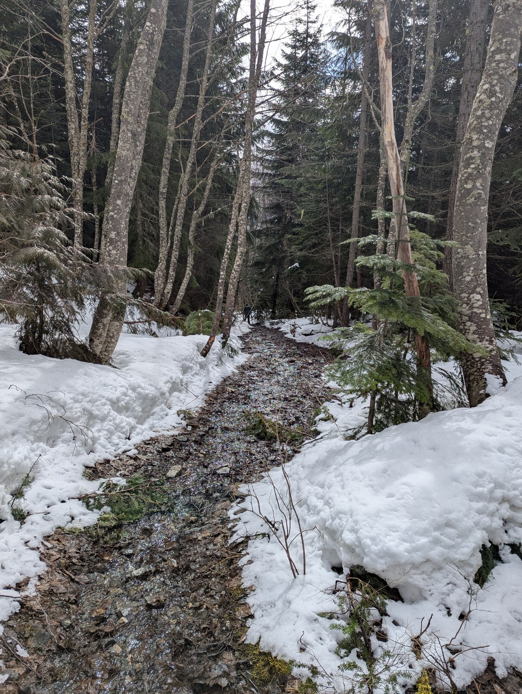 The trail is in good condition with small patches of snow after about 0.5mi, then after the first big turn in the trail (after the first bridge), the snow begins in earnest. We were able to proceed without snowshoes or spikes to the next water crossing (no bridge), spent a bit of time walking in runoff before encountering more snow where snowshoes are best. Since our group didn't all have snowshoes and we had a time crunch anyway, we opted to turn back at that point, roughly 1.65mi into the trail. I expect with no new storms, this will melt out over the next few weeks pretty quickly.