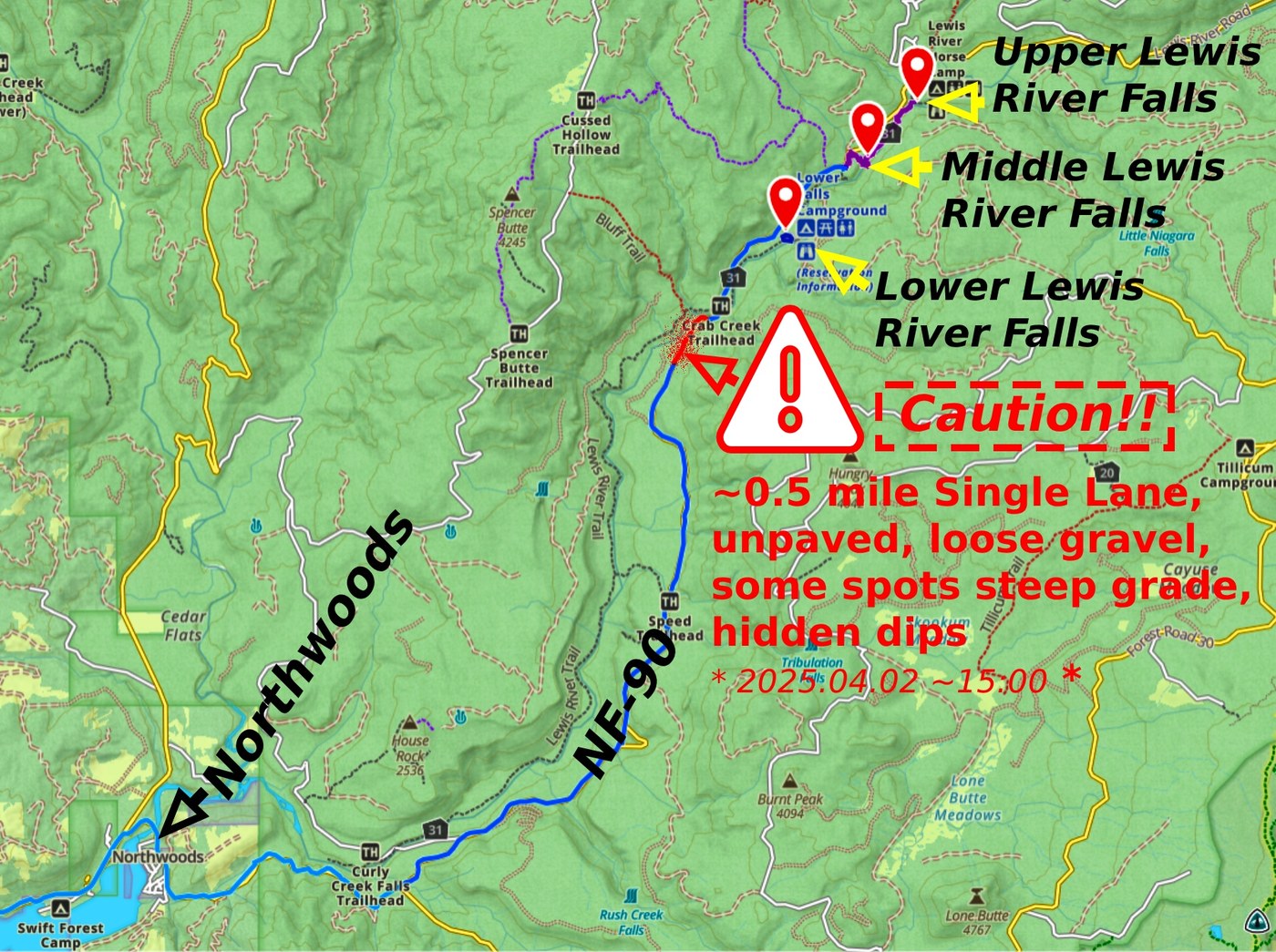 Please note that the NF-90 is generally good driving condition. At the same time, please note: ~12 miles after Northwoods, after the Pavement ends, the next ~0.5 mi is "iffy" (please refer to picture attached): Single-Lane, unpaved, loose gravel, some spots steep grade, and hidden dips.