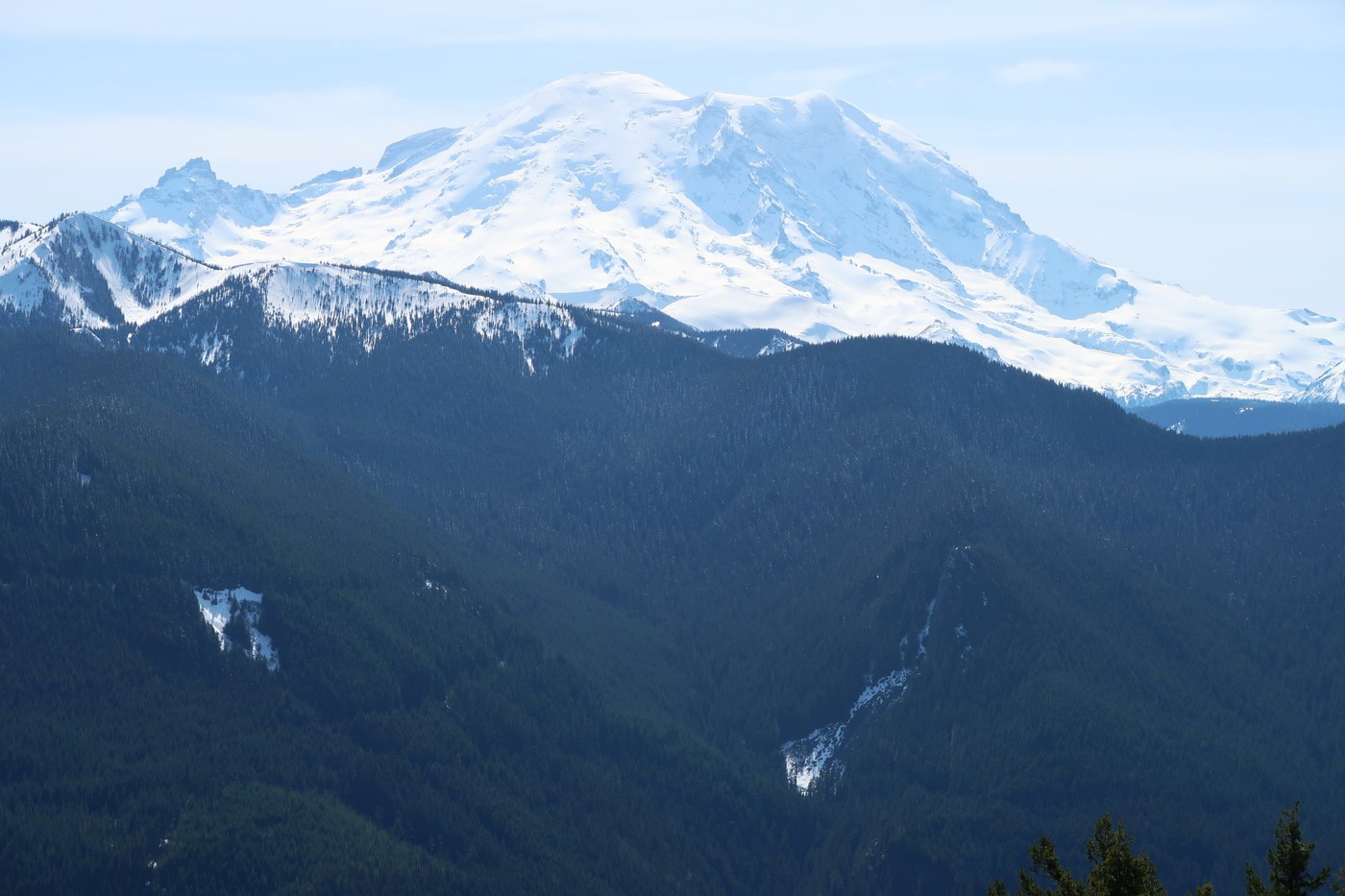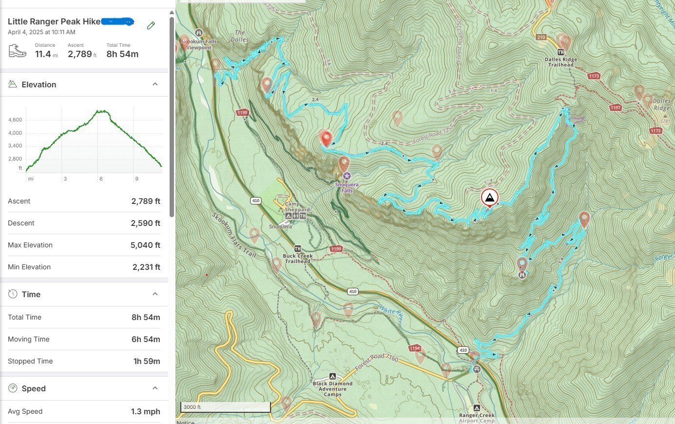 We started at the Palisades trailhead and ended at the Little Ranger Peak trailhead, both off of Hwy 410, one way with cars at both ends. The Palisades trail all the way to Little Ranger Peak (6 mi) is in great shape. Some trees down across the trail but nothing hard to navigate. We did have to bushwhack up to Little Ranger Peak, because the snow had started a ways below and we did not see a trail. Nice view from the Peak. We did not use any spikes to this point, but some might prefer them, especially if freezing temps return.