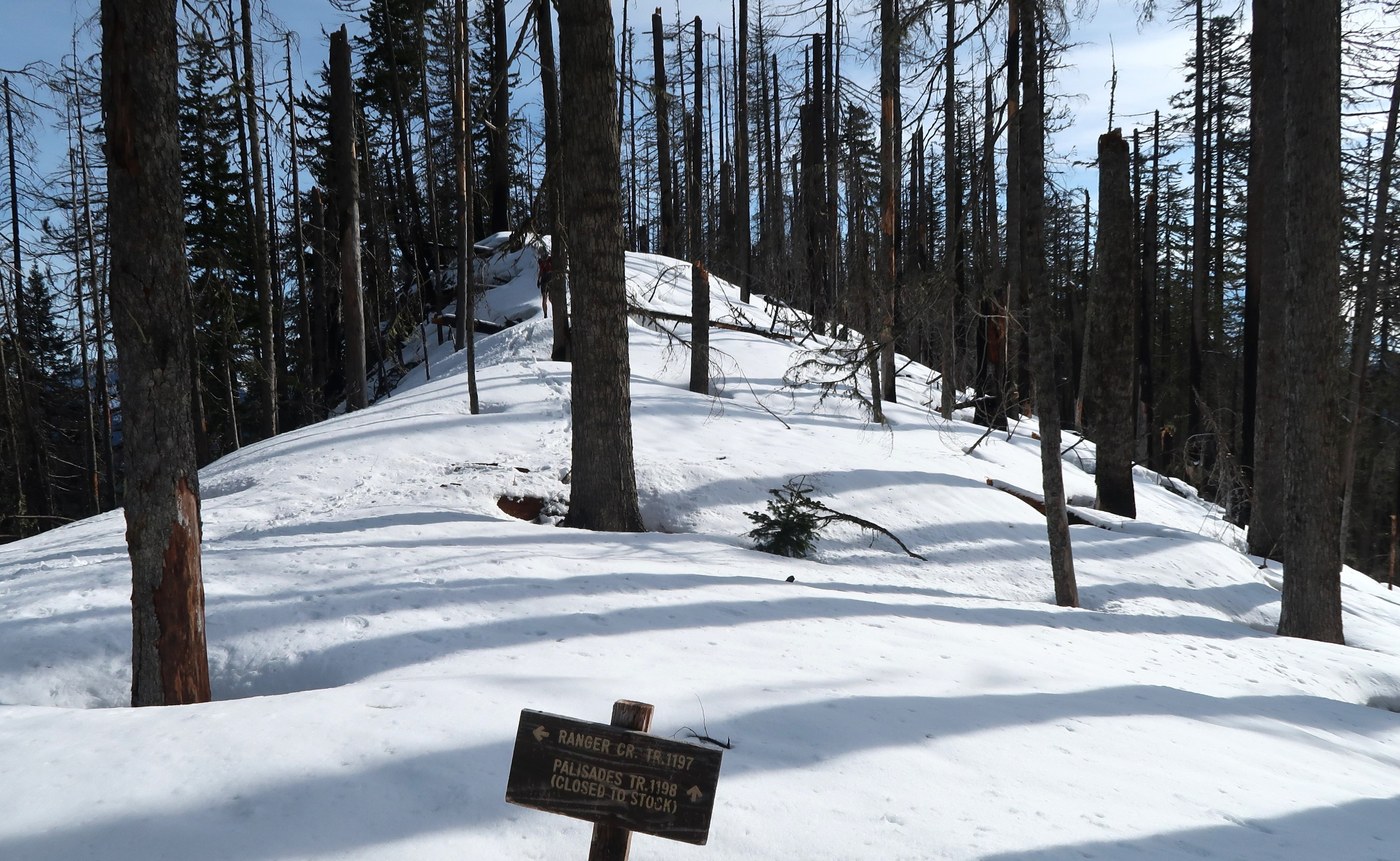 After enjoying the great view from Little Ranger Peak, (Which had a peak registry, but no paper. If you’re going you might take some along for the registry.) we headed down the Little Ranger Peak trail. Along the ridge there were no tracks in the now deep snow, so we had to do a lot of route finding, because there were TONS of blowdowns and LOTS of snow to cover all the holes that happen beside blowdowns (major sketchy post holing). Snowshoes, which we did not have would have helped a LOT here. The going was very slow. Then below the ridge the mass quantities of blowdowns continued, making the go very slow and difficult. Snowshoes would not help here, just slow climbing through the messes. The trail finally cleared a bit above the lookout, 3 or so miles from the Little Ranger Peak trailhead. I’d wait till some crews get the trail cleared before doing that one all the way to Little Ranger Peak again. But the Palisades approach was fine.