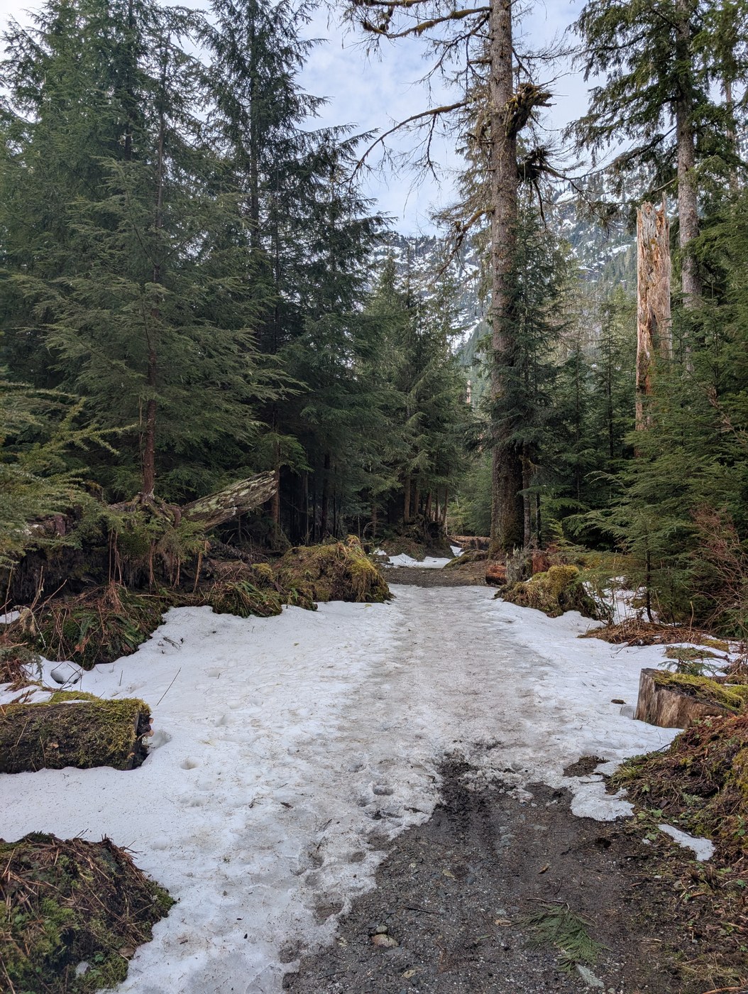 The trail was pretty dry and mostly in good shape, no trees across the trail. There were only small patches of snow until the viewpoint. The mountains were magnificent today, cascading waterfalls everywhere. There are signs and a little rock circle marking the end of the relatively safe zone. From here you can watch the waterfalls with a nice big basin between you and the mountain that should catch most avalanches.