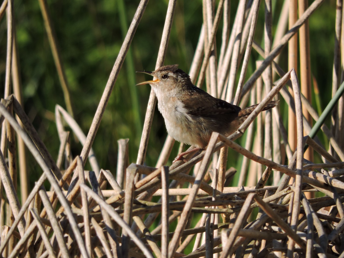 Out on the boardwalk there were lots of swallows or swifts soaring around catching their dinner. We heard many birds as we walked, and my sister was very excited to see a Marsh Wren sitting on it's nest. There was also a Canada Goose out in the distance hanging out near the water.