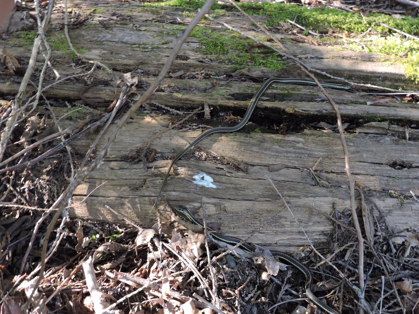 We saw several Garter Snakes across from the schoolhouse (or whatever the building is with the grey whale skeleton). We saw one initially and as we observed it, at least 4 total slithered out from the leaves and brush.