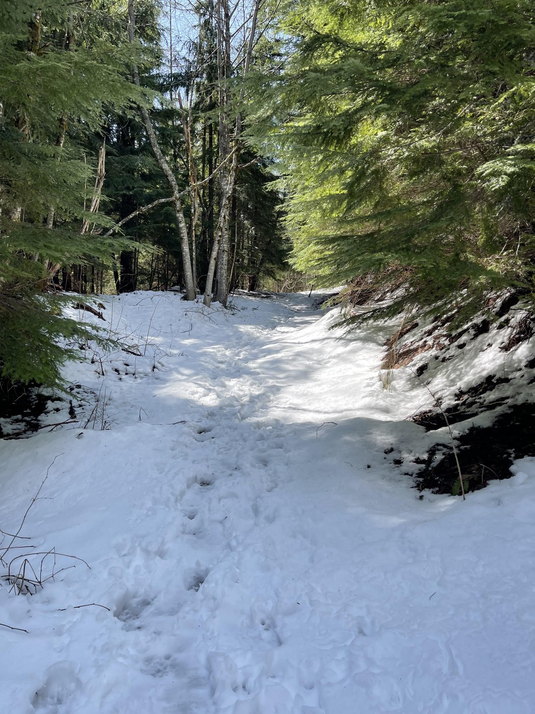 There’s a lovely viewpoint/rest spot about 3.5 miles from the start, and I started to notice snow shortly before this spot. The break spot was nice and sunny, so I enjoyed a leisurely snack (and cleaned up someone else’s recently left behind eggshells from their hard boiled egg…Leave No Trace). After this point, the snow became increasingly thick. I put microspikes on at the turnoff for Si. They helped…some. The snow was fairly slushy but deepening at this point, and it was slick at times. I was glad to have the spikes but could tell from footprints that others didn’t use them.By the top, the snow was nearing 3-4 feet deep in places.
