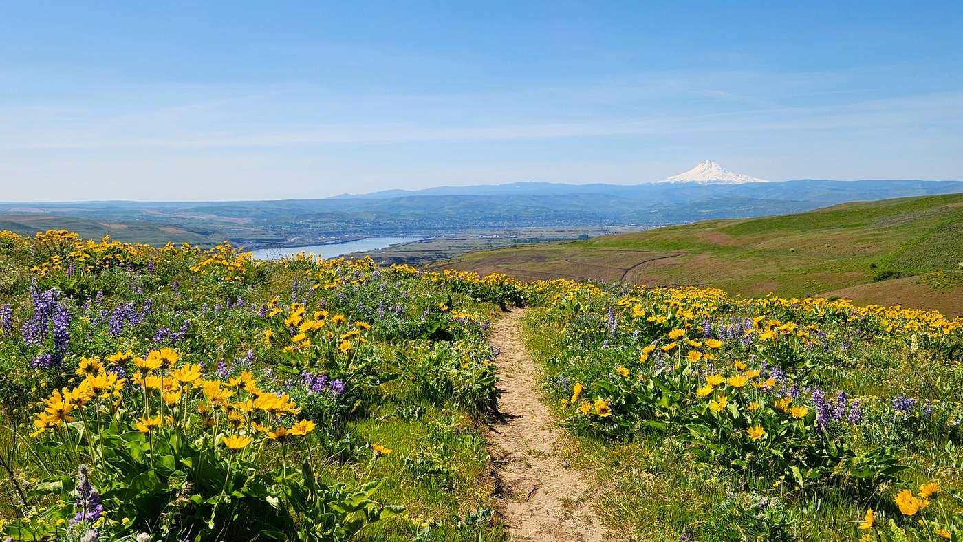 Beautiful trail to visit in the Springtime! Eightmile Creek waterfall is close to the beginning of the entry road trailhead. There's one small stream crossing which is easy to keep your feet dry, especially with poles. Wildflowers: Arrowleaf balsamroot, lupine & phlox. No snakes on my hike and big views of Mount Hood & the Columbia River. Please leave no trace. Happy Trails!