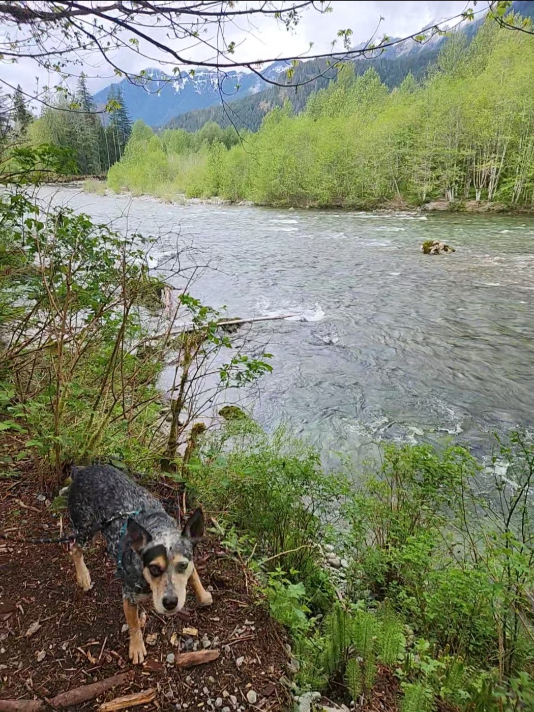 We rolled into the parking lot at 9:45 and were the first in the lot-- going hiking on a misty morning pays off! Lots of early spring foliage, berry buds starting to bloom, drapey foliage over the trail, and mosquitos on you when you pause. There are a handful of up and overs, but nothing the medium dog couldn't navigate himself. We're coming home with mud splat pants. Total move time: 2:15.