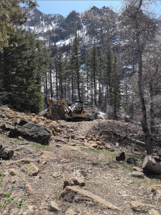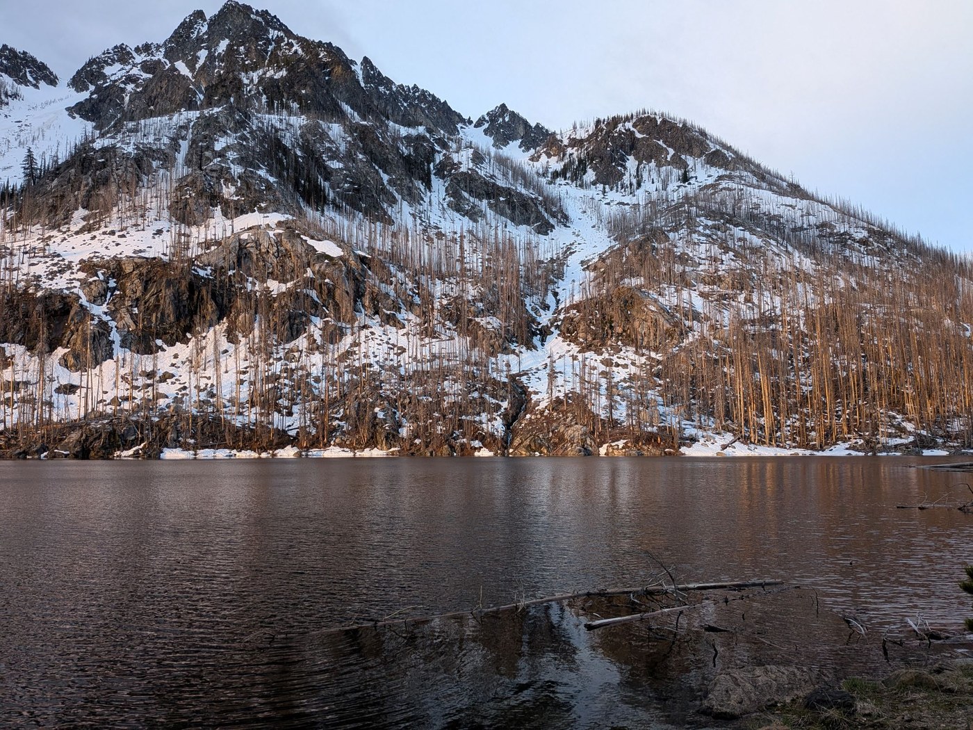 Eightmile Lake was interesting. There was a little backhoe by the outlet. Not exactly sure what they are doing but it's right by the dam. Much of the lakeshore trail is poorly maintained. It's hard to spot the trail and many trees have come down, especially in the burn zone. I went almost all the way to the end, where I believe there are a few camping spots. I could see it was all in a burn area with no attractive sites. I headed back the way I came and camped at a decent spot, except for a dead leaner. Also not great was the fact I did not bring my inner tent, expecting to camp on snow. It wasn't a problem until I found a tick crawling on my ground sheet. *sigh*