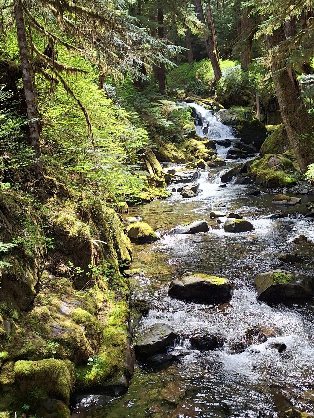 The Lover's Lane trail is not an easy walk, but it is one of the most beautiful hikes that I have ever taken. You are in the middle of the rain forest with all of the beautiful trees, moss, lichen, ferns, and log bridges fording streams. The trail itself is fairly flat, there is only a 200 foot elevation gain. But it is narrow and rocky with lots of tree roots. If you have the time and the energy, it's well worth the effort.